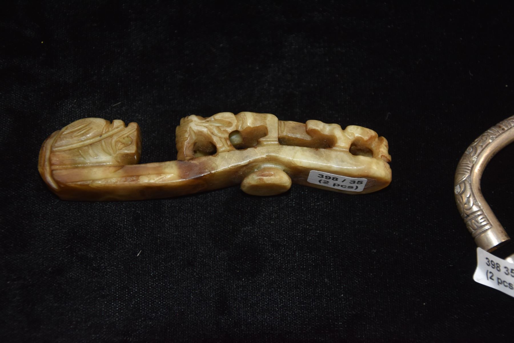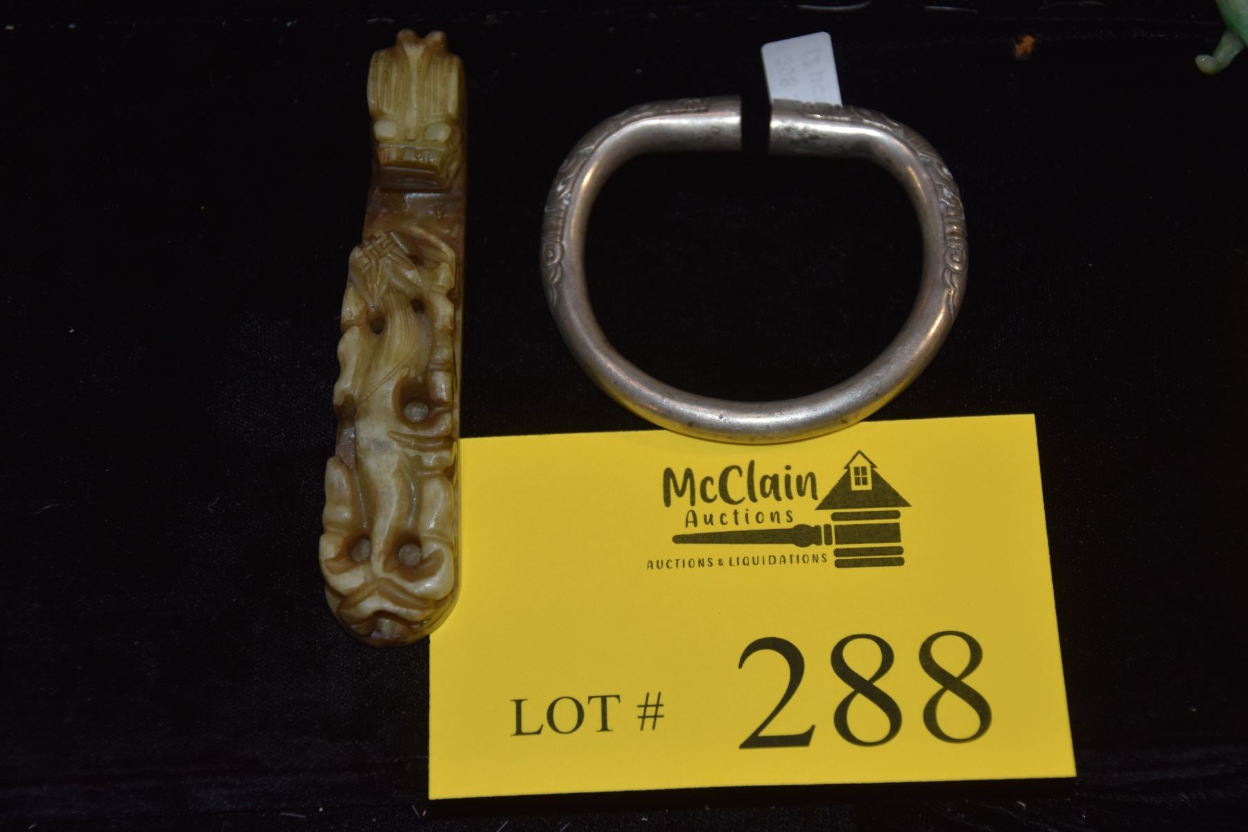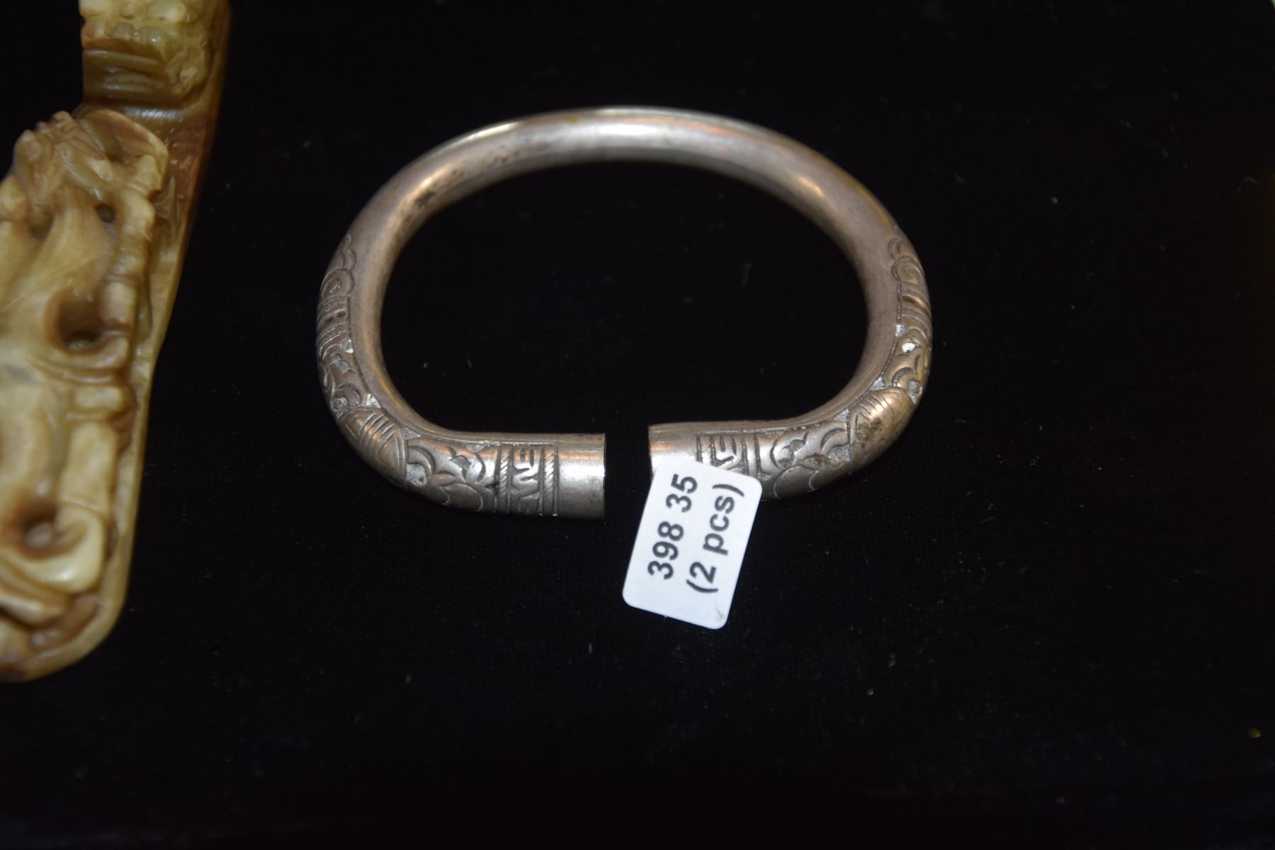 CHINESE ANTIQUE SILVER BANGLE & SERPENTINE JADE DRAGONS BUCKLE (2 PCS)