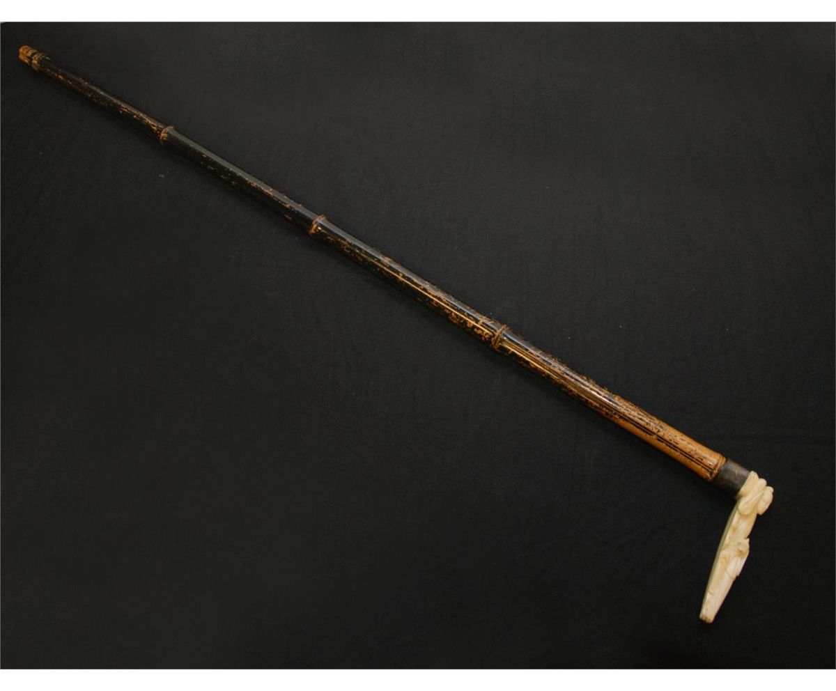 Chinese cane having a bamboo shaft. Etched silverplate collar securing an antique 19th century carved ivory figural handle. Handle depicts a recumbent female resting on pillow. Cane measures 34 3/4" length (88.2cm). Handle measures 4 3/4" length (12cm). Total weight of 208 grams.