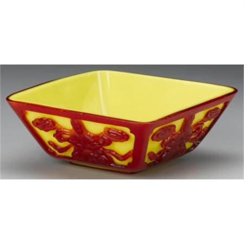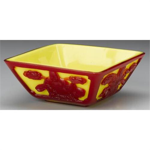 <B>CHINESE GLASS BOWL</B></I><BR><BR>Chinese Beijing red overlay glass bowl, of square shape, with designs of seated guanyin to each side, on a yellow ground<BR>5in. x 5in. x 2in.<BR><BR> <B>Condition Report:</B> Normal signs of wear as appropriate with age; very minor chips to rim.<BR><BR><b>Shipping:</b> Miscellaneous Collectibles, Larg (<a target="_blank" href="http://www.heritageauctions.com/common/shipping.php">view shipping information</a>)