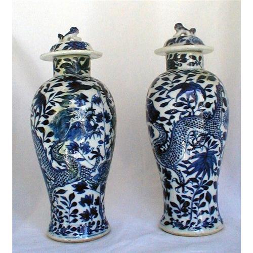 One Jar appears to have had a hairline on central body. The other jar has had damage to mid body, a large chip restored. Both repairs are covered with white slip, repainted skillfully with cobalt paint, reglazed. I have viewed these repairs under 10 power magnification. Would love to hire the restorer.