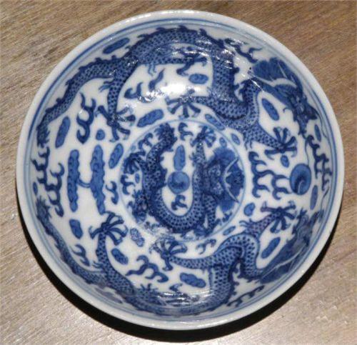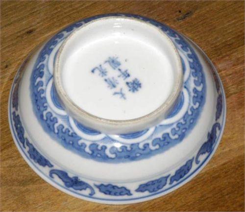 CHINESE BLUE AND WHITE DISH with dragons, Guangxu marks, 3 1/2" diamter
