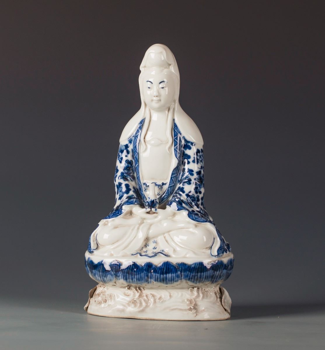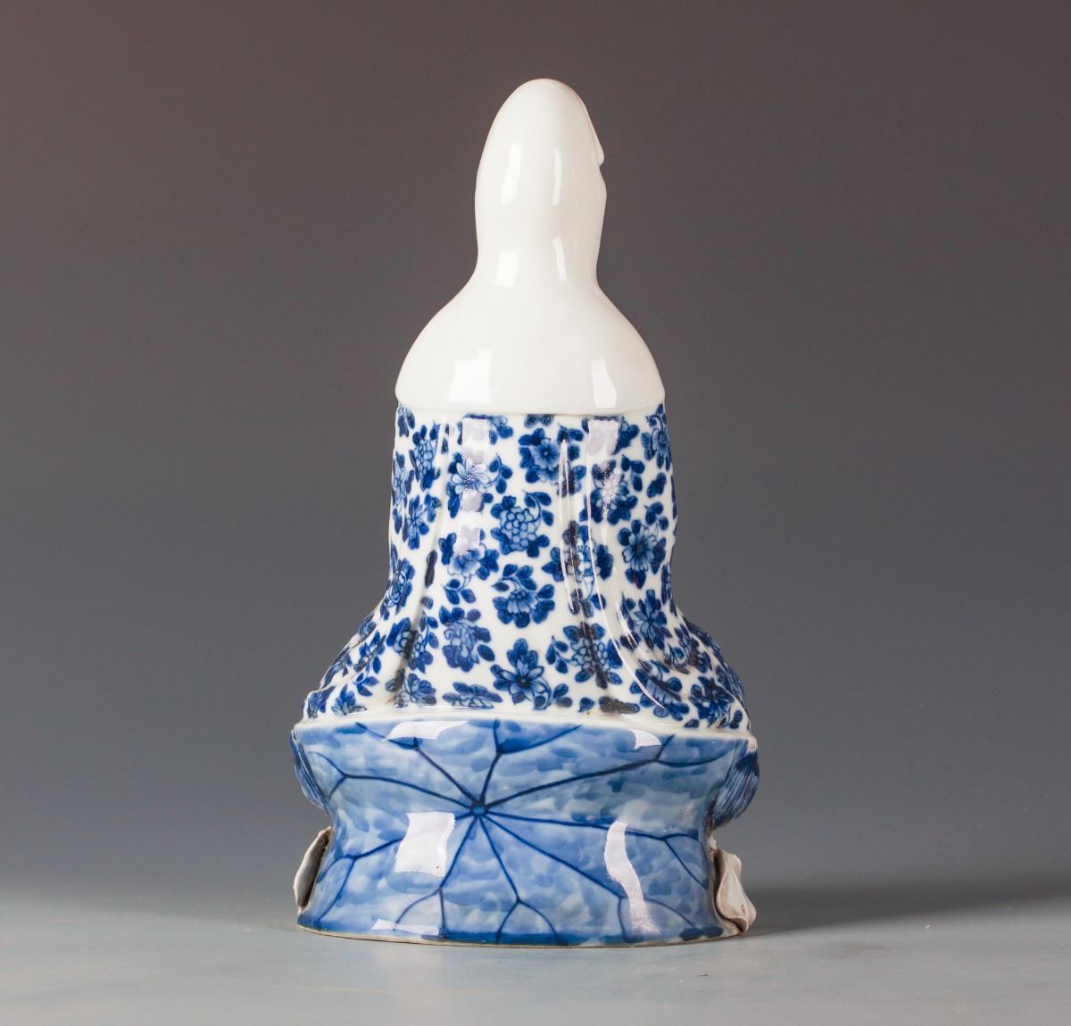 Chinese Blue and White Porcelain Guanyin Statue, depicting the guanyin with white hair, wearing the long robe with blue flowers design, seated on the two-layer lotus stand and holding a willow leaf vase, seal mark on the bottom. Length 5.5" Width 4" Height 7.5"