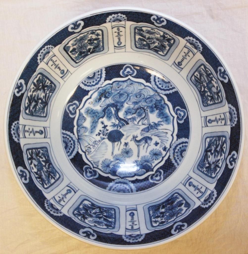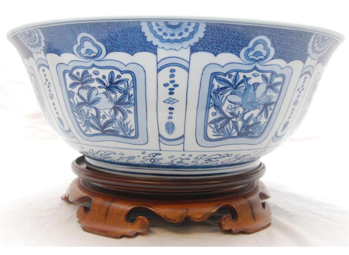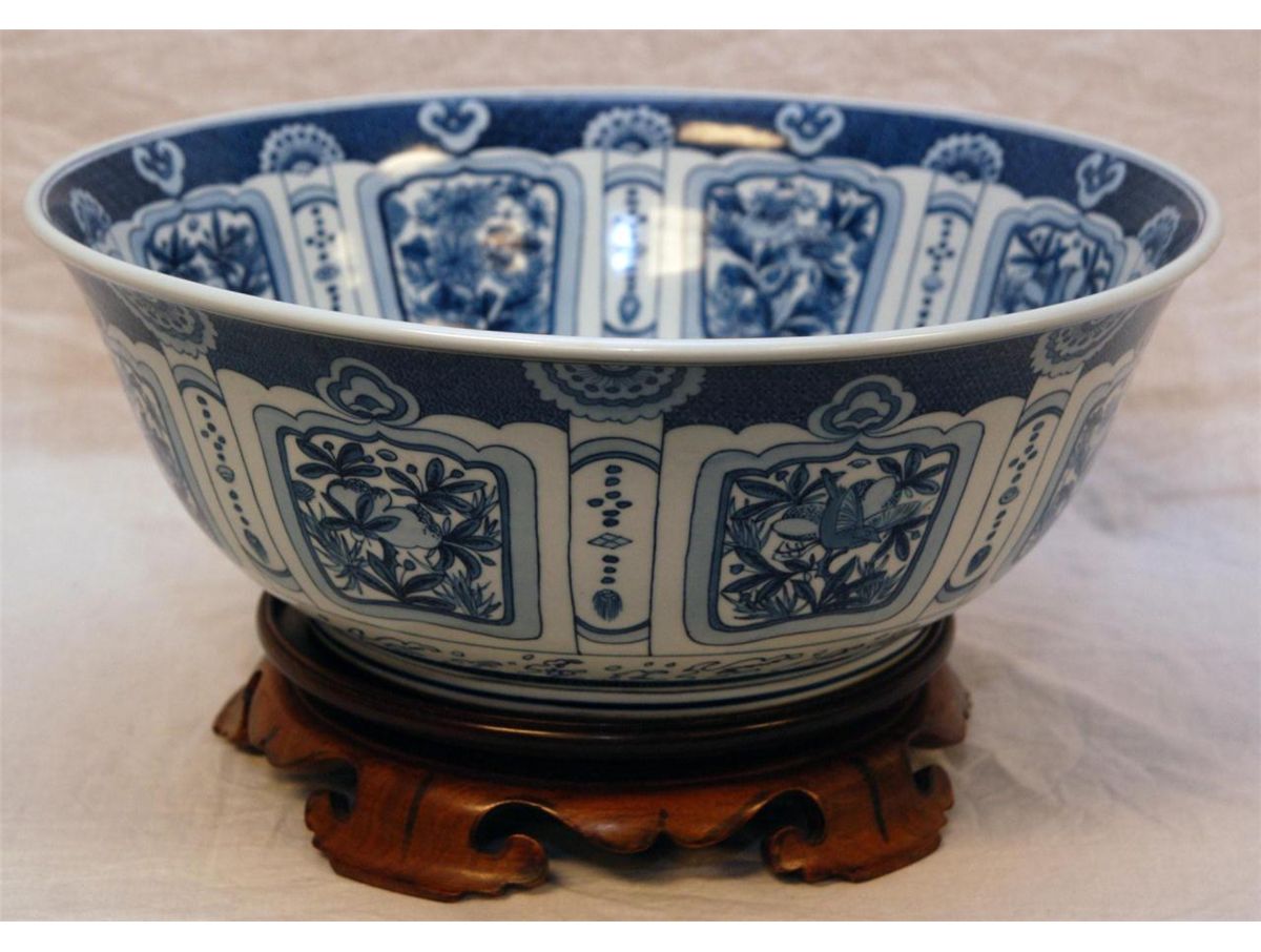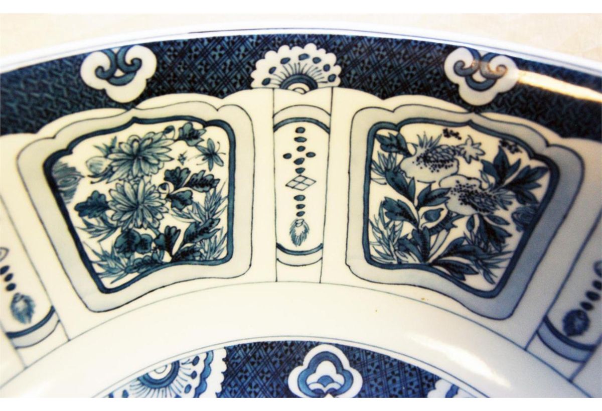 Chinese hand painted blue and white porcelain bowl depicting floral scenes throughout. Bottom holds six character blue calligraphy Ming Dynasty Longqing reign marks, but made 19th/20th century. Measures 6" height x 15 3/8" diameter + 2" base height (15.2cm x 39cm + 5.1cm). Total weight of 4.92 kilograms. Provenance: Sam Feldman Collection.