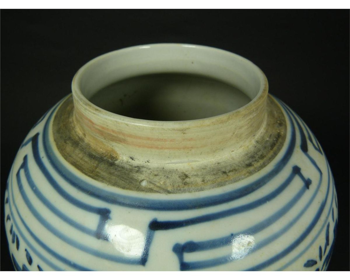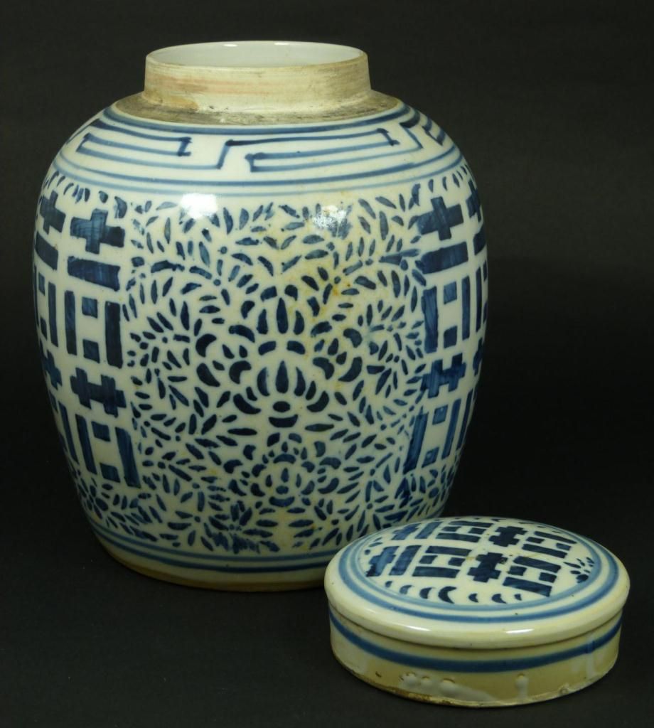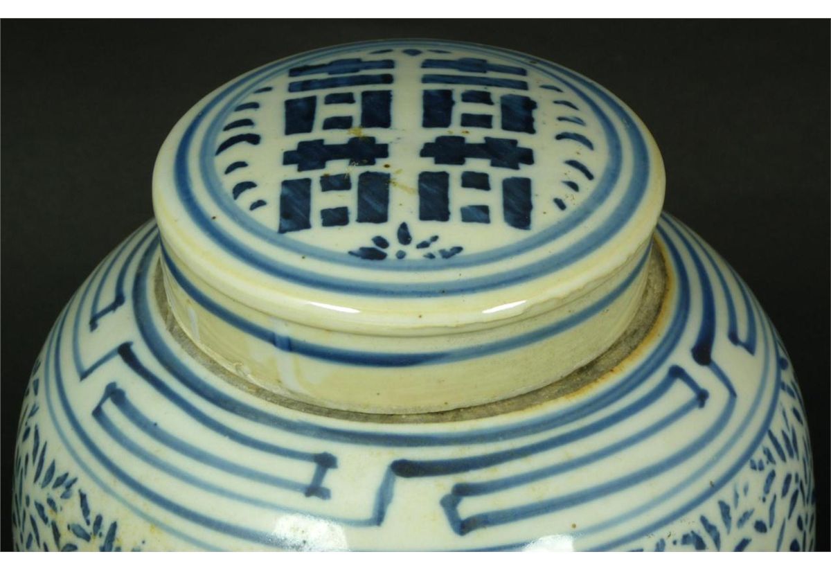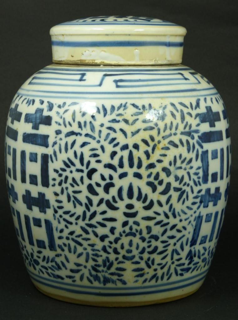 Antique Chinese blue and white porcelain hand painted covered ginger jar having I Ching symbol designs to body and cover with sectioned floral designs. Cross T pattern design to neck. Late Ming to early Qing dynasty period. Holds double band with curved mark to bottom. Measures 9 3/4" height (24.7cm). Total weight of 2.28 kilograms.