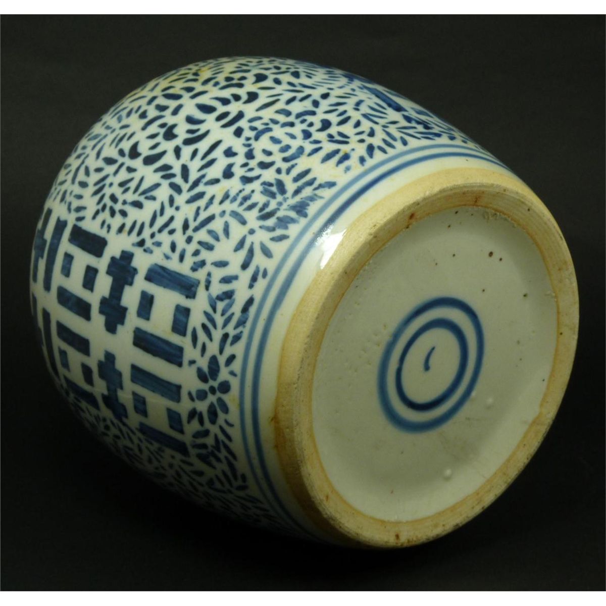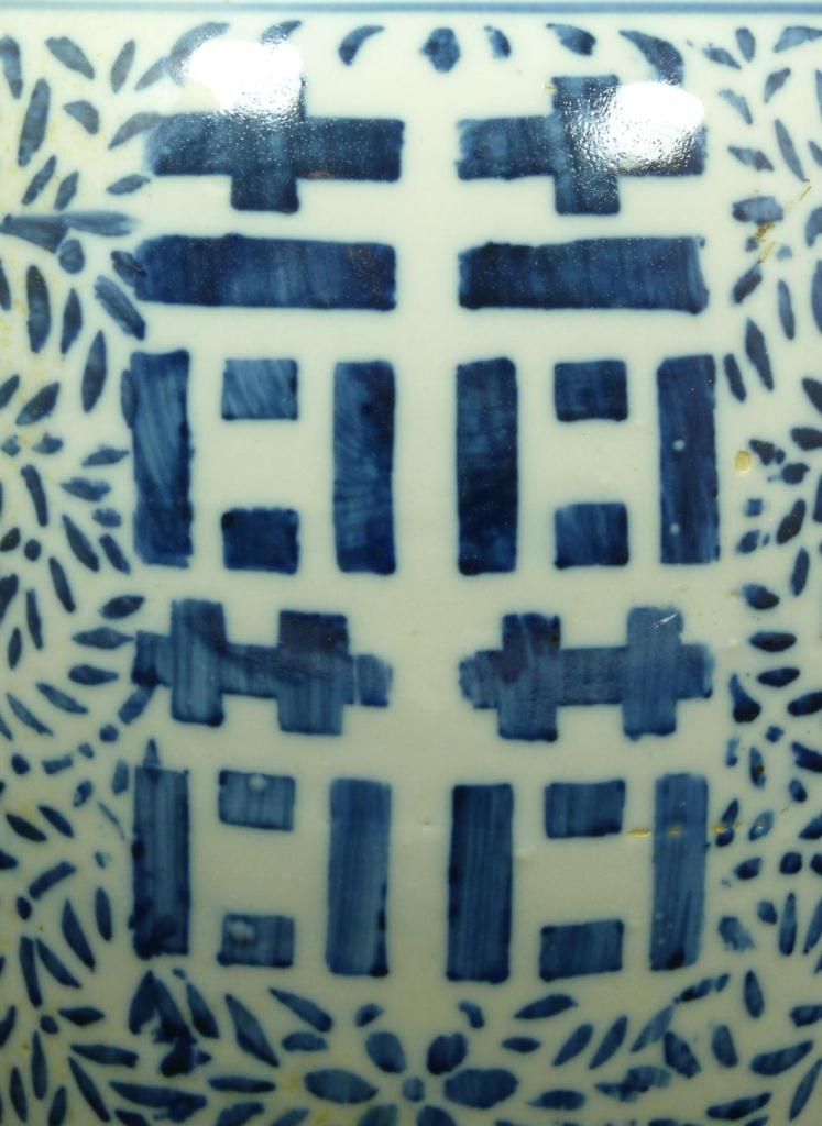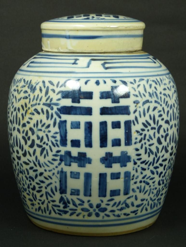 Antique Chinese blue and white porcelain hand painted covered ginger jar having I Ching symbol designs to body and cover with sectioned floral designs. Cross T pattern design to neck. Late Ming to early Qing dynasty period. Holds double band with curved mark to bottom. Measures 9 3/4" height (24.7cm). Total weight of 2.28 kilograms.