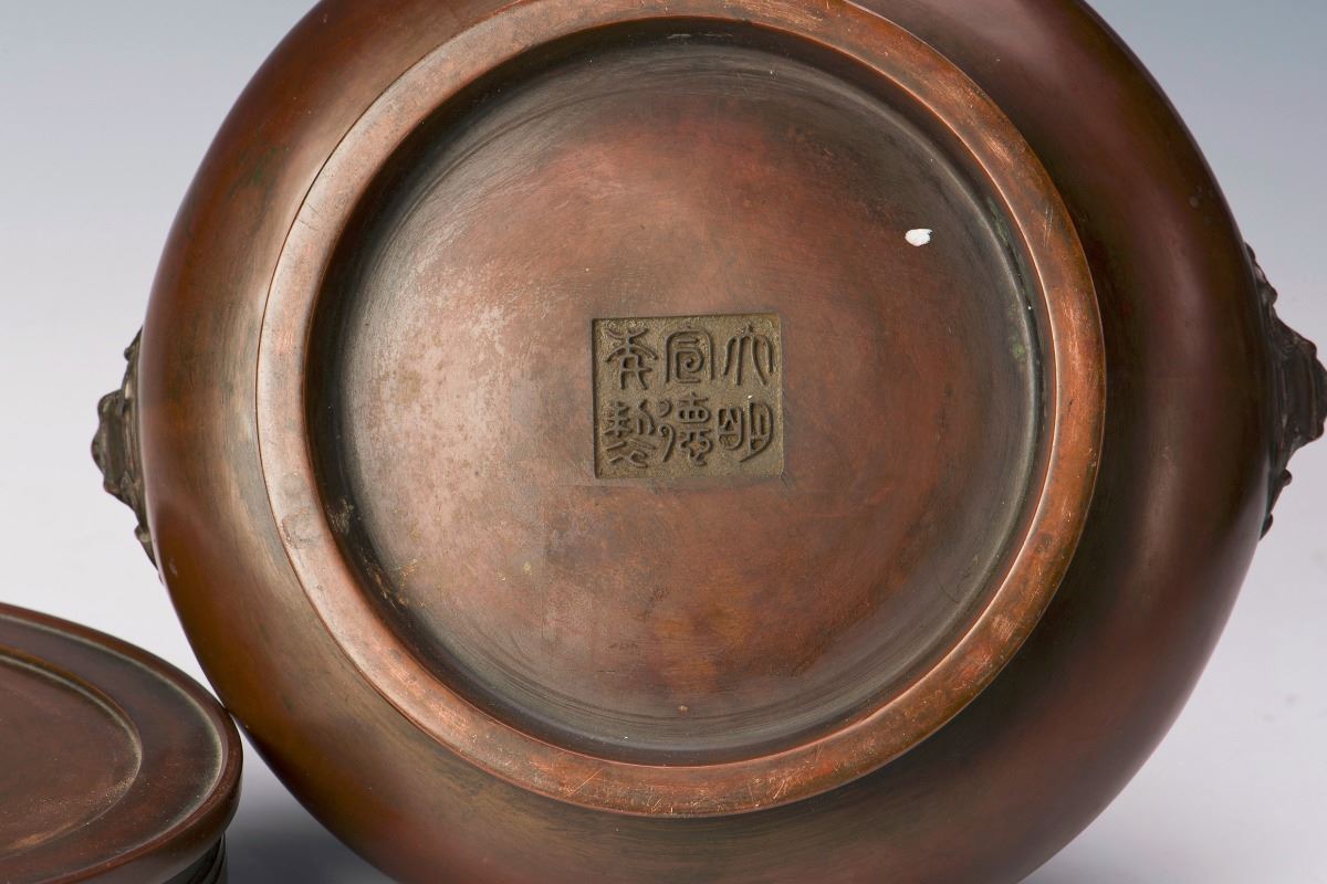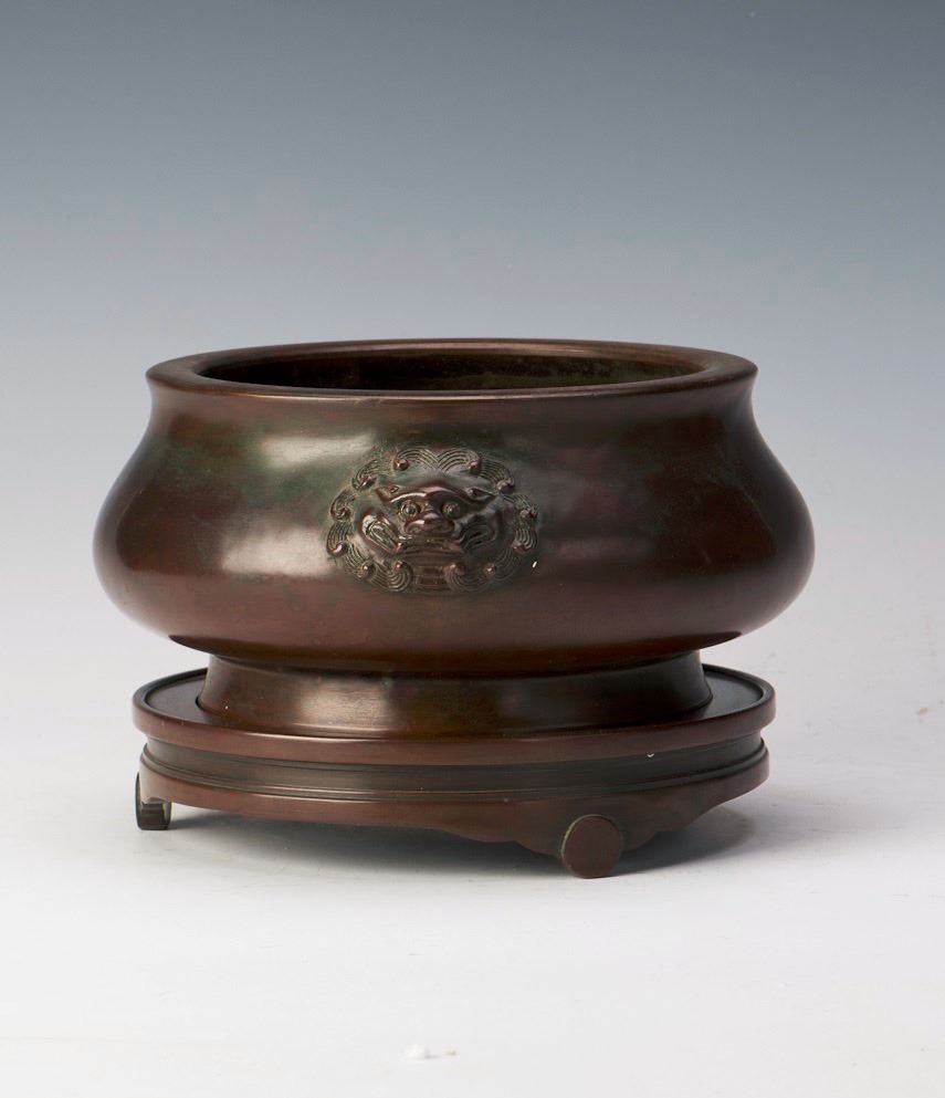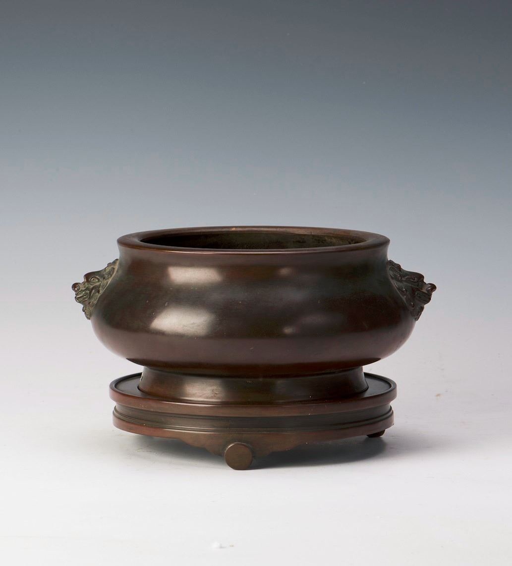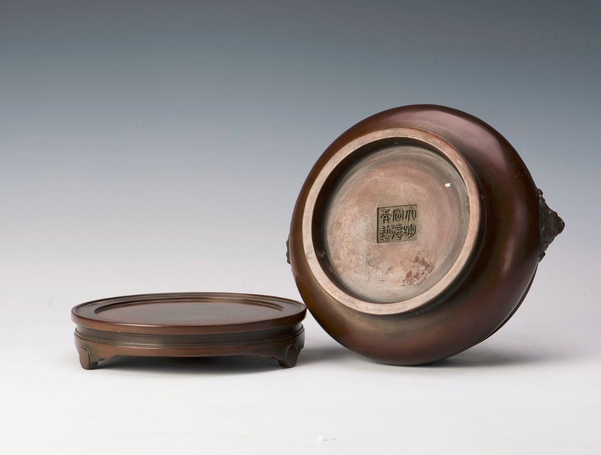 The slightly everted mouth rim atop a short convex body all raised atop the three short conical feet beneath the flat base bearing a six character Xuande mark crisply cast in an archaistic script within a rectangular cartouche. Height 7" Length 11" Width 4.25"