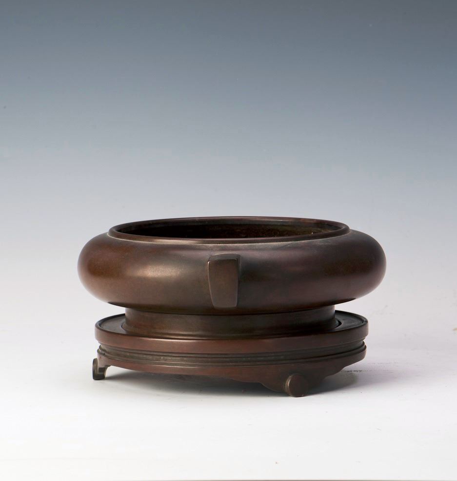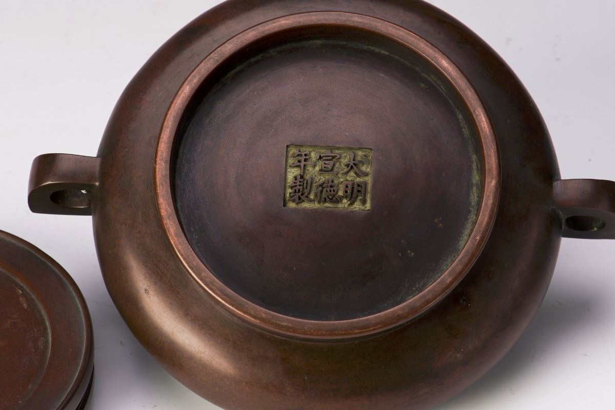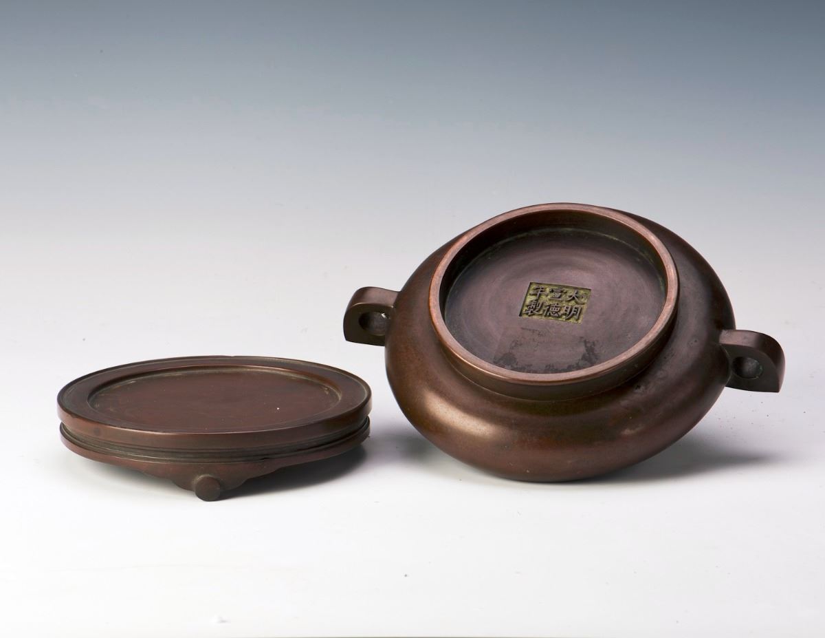 With inverted mouth and ovoid body raised on a foot rim encircling a concave underside bearing a six-character Xuande mark cast in standard script within a rectangular cartouche. Height 2.75" Length 9.75" Width 7.75"