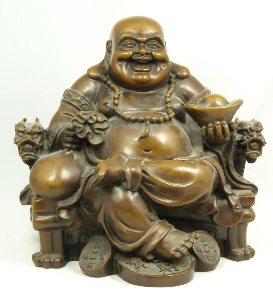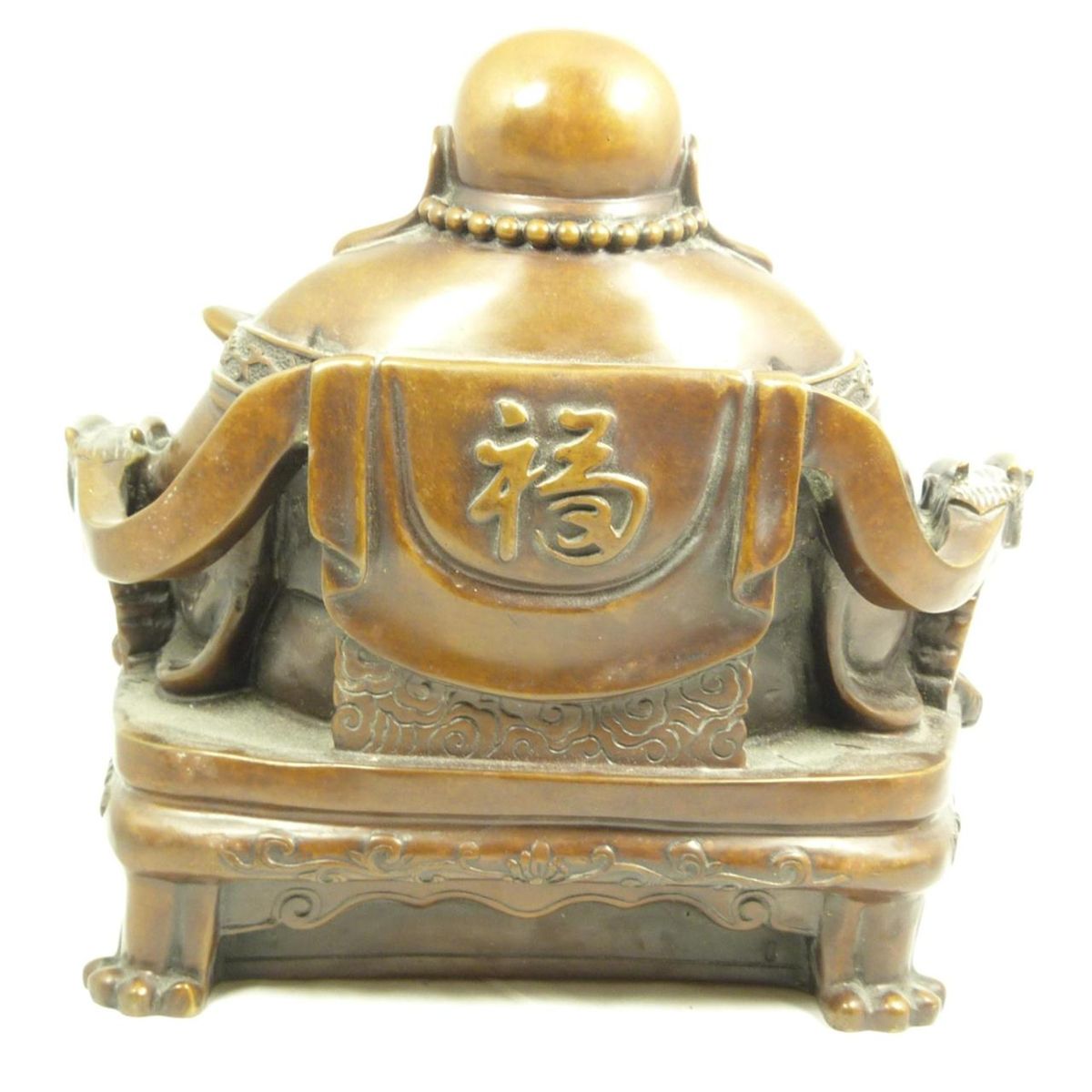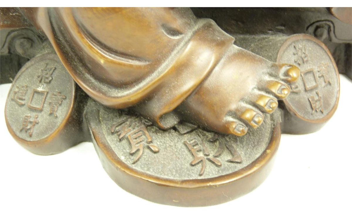 Chinese bronze sculpture depicting a seated Buddha on dragon throne and holding gold with bag. At his feet are coins. Measures 9 7/8" height (25cm). Total weight of 7.52 kilograms.