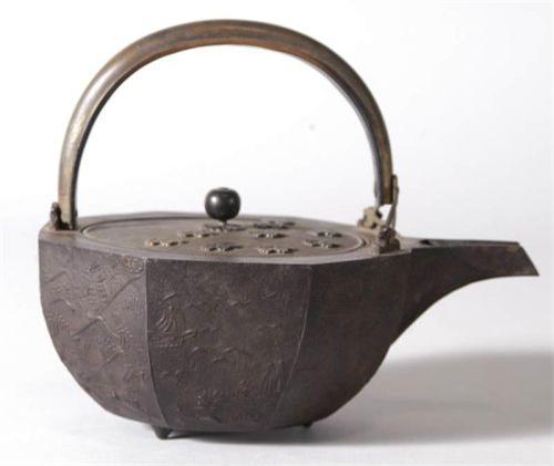 CHINESE BRONZE TEAPOT, with scenic decoration