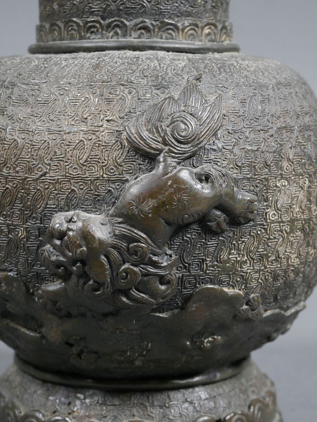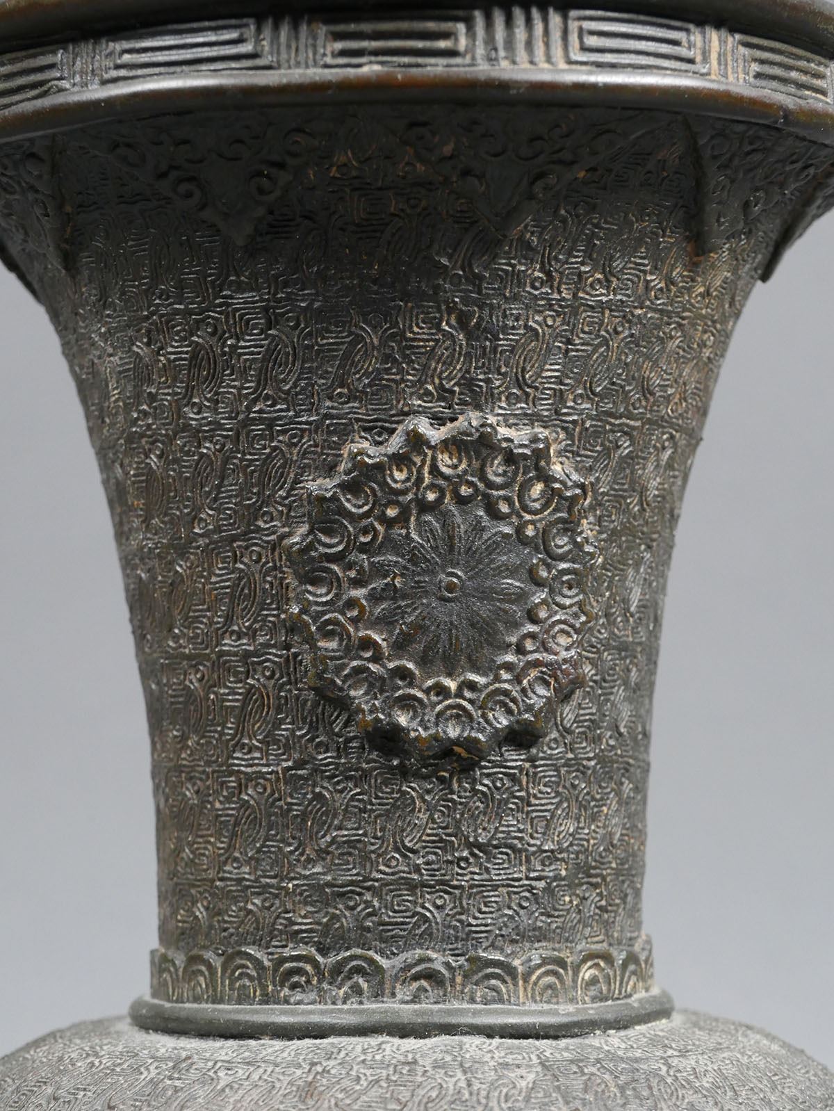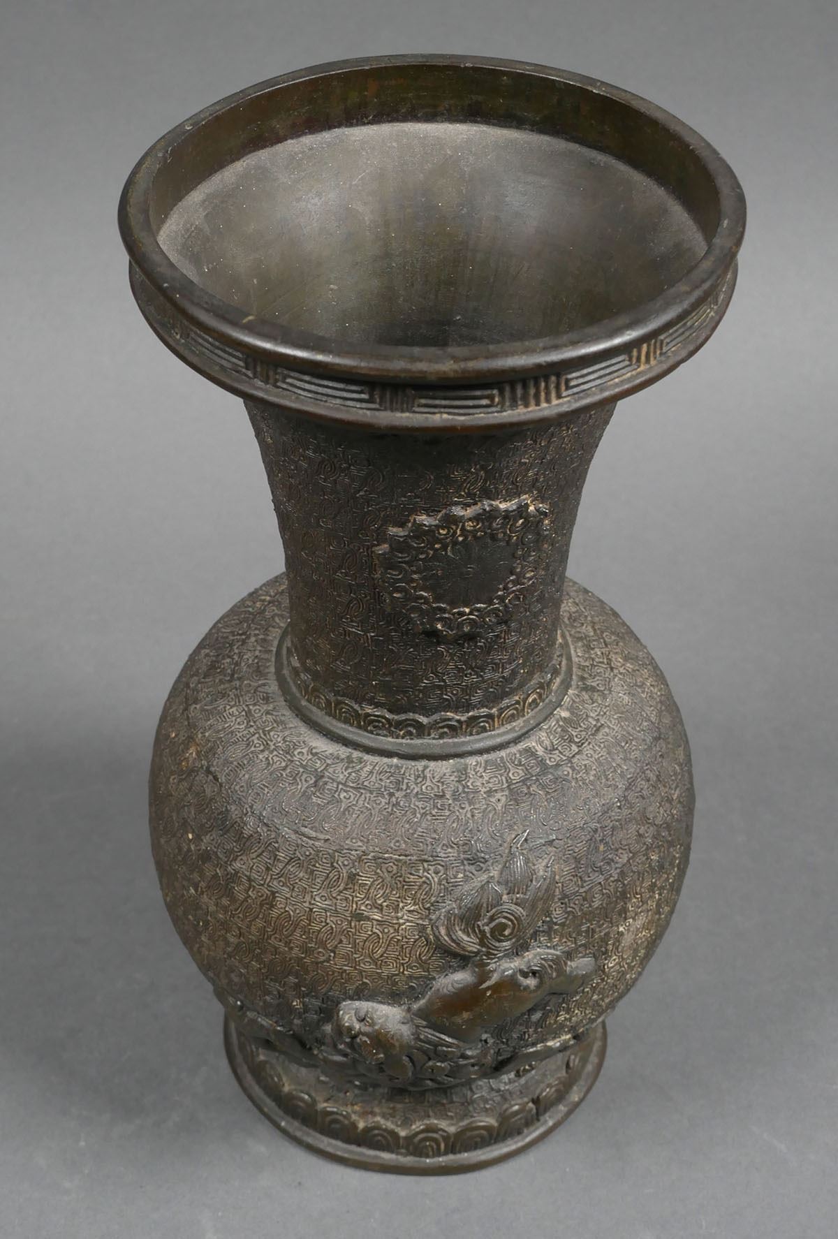 Antique Chinese gu vase with raised archaistic designs and images of foo dogs or shishi. Measures 9 3/4" tall. Good condition with some wear, including a few small holes.