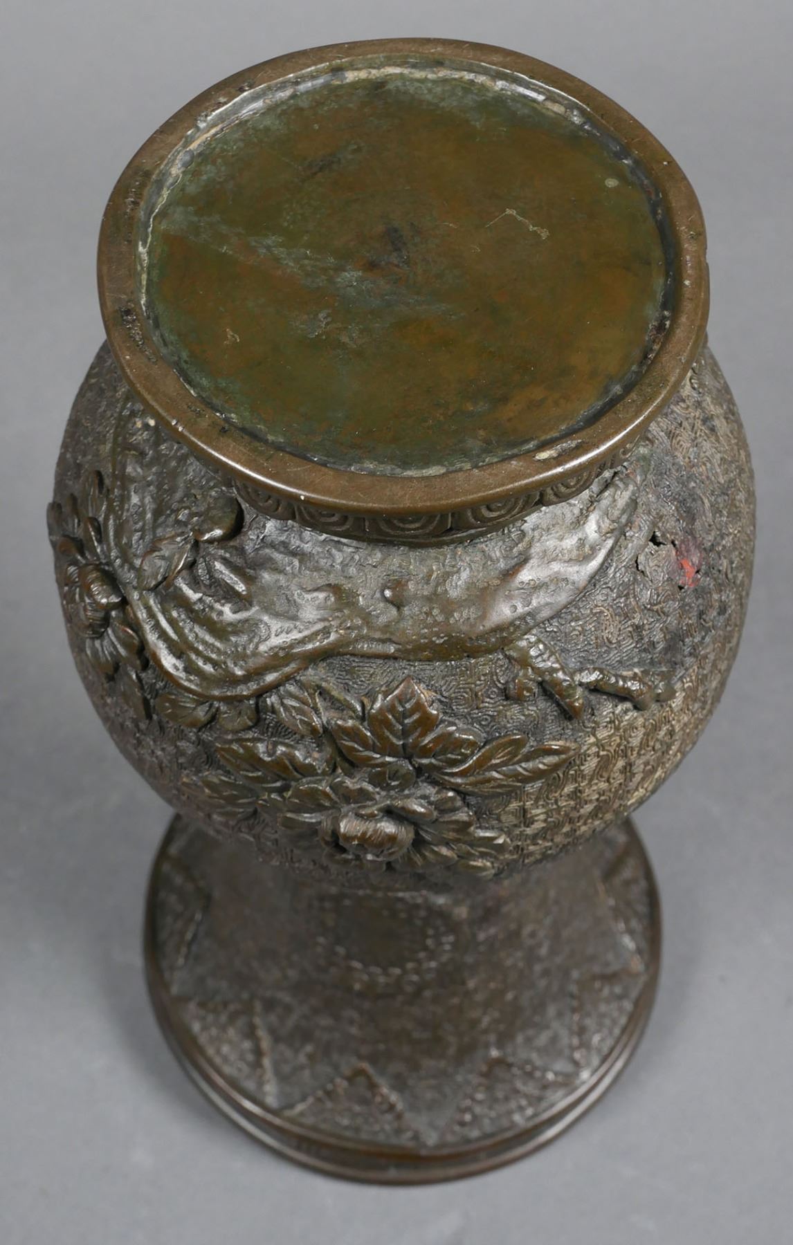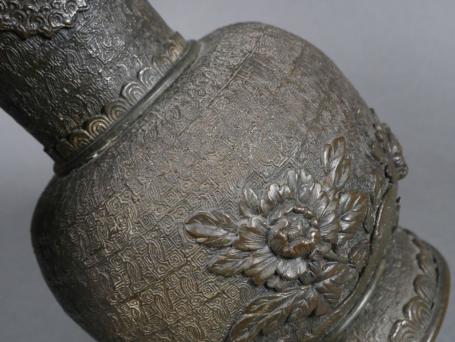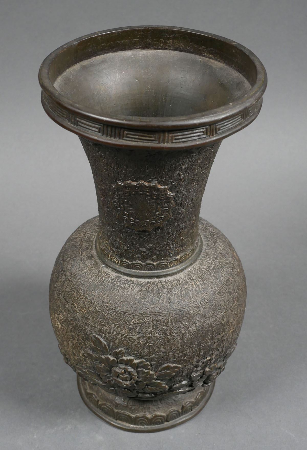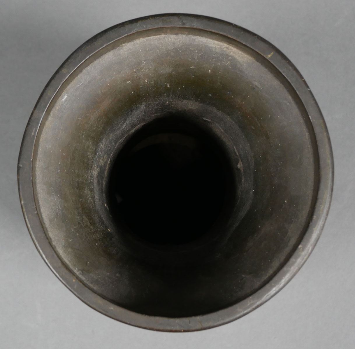 Antique Chinese gu vase with raised archaistic designs and images of foo dogs or shishi. Measures 9 3/4" tall. Good condition with some wear, including a few small holes.