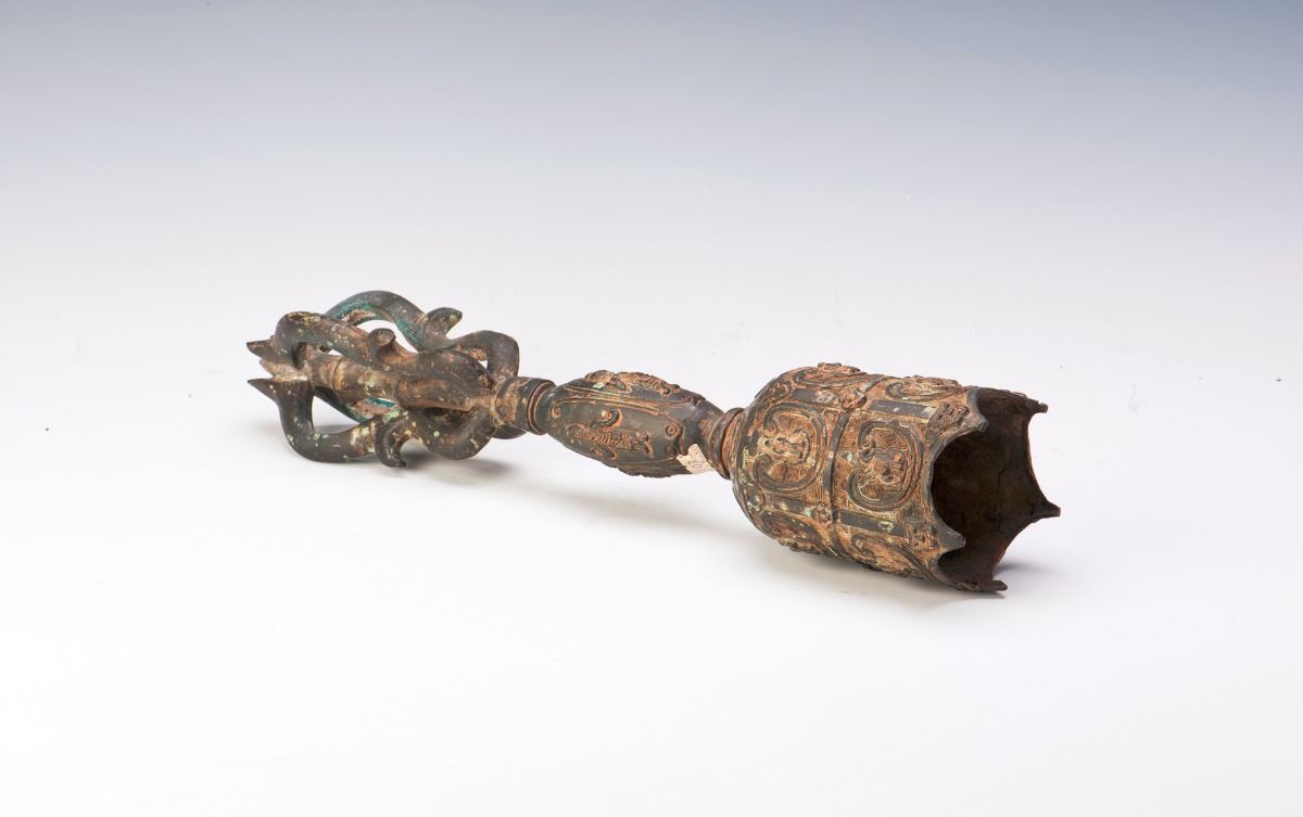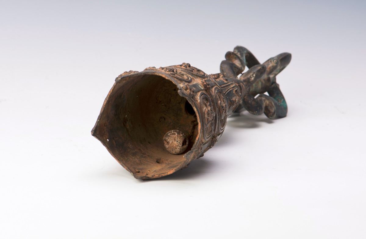 A rare Chinese bronze ware bell with exquisite carving and relief, unique form. Diameter 3.5" Height 6"