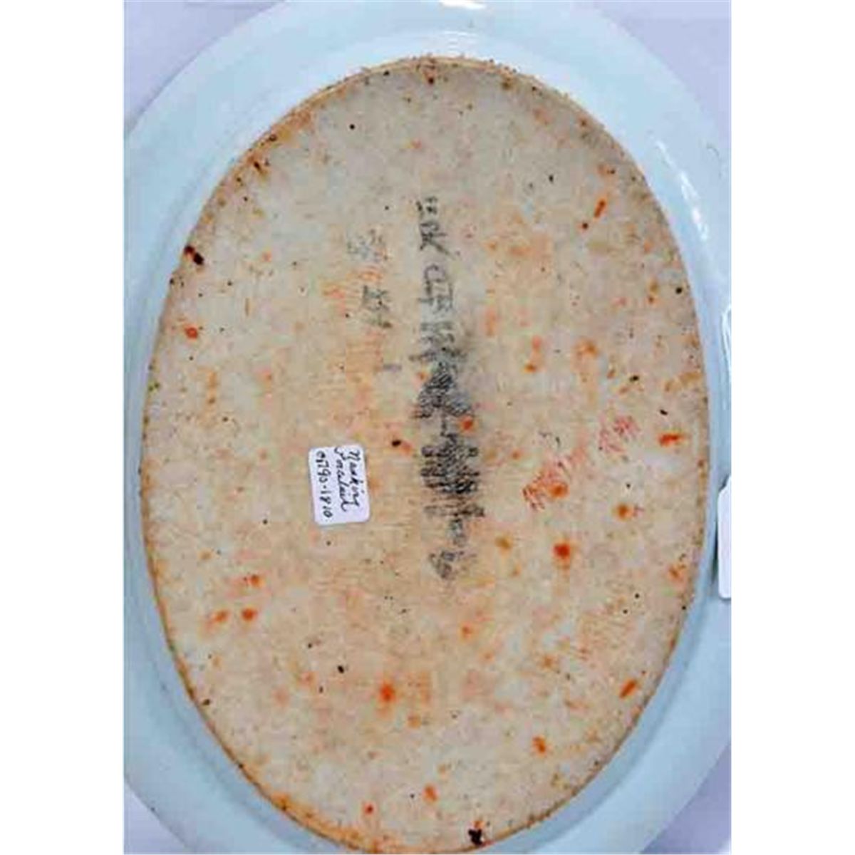 CHINESE CANTON BLUE & WHITE PLATTER, SAUCERS, & PITCHER, ANTIQUE, FIVE, L 4~-12~:Including 1 Nanking porcelain pitcher with a white ground with hand painted blue motifs of pagodas which surround a body of water, no apparent marks, H. 5 3/4~, L. 4 1/2~; 2 saucers with a double border of slanted lines around an image of two architectural structures that are beside a lake, no apparent marks, Dia. 5~ and 5 3/4~; 1 saucer with a single building at the center of the well, no apparent marks, Dia. 5 1/2~ and 1 oval platter with geometric borders around a central scene which depicts a village full of buildings, tress and people, the underside is faintly stamped in black ink with Chinese characters RP219