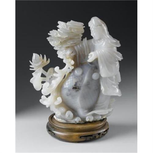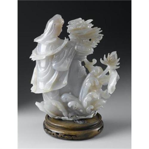 <B>CHINESE CARVED AGATE CELESTIAL BEAUTY</B></I><BR><BR>Chinese carved agate, depicting a celestial beauty holding a pearl above the mouth of a carp amid waves and lotus. On a wood stand<BR>7in. high<BR><BR> <B>Condition Report:</B> Minor chipping at edges.<BR><BR><b>Shipping:</b> Miscellaneous Collectibles, Larg (<a target="_blank" href="http://www.heritageauctions.com/common/shipping.php">view shipping information</a>)