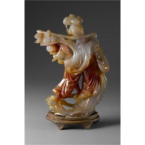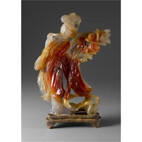 <B>CHINESE CARVED AGATE FIGURE</B></I><BR><BR>Chinese carved agate figure of a beauty, with flowing robes, and carrying a basket of flowers. Of orange and pale lavender coloration. On a wood stand<BR>11-1/2in.high x 8-1/2in. wide<BR><BR> <B>Condition Report:</B> Normal signs of wear as appropriate with age.<BR><BR><b>Shipping:</b> Miscellaneous Collectibles, Larg (<a target="_blank" href="http://www.heritageauctions.com/common/shipping.php">view shipping information</a>)