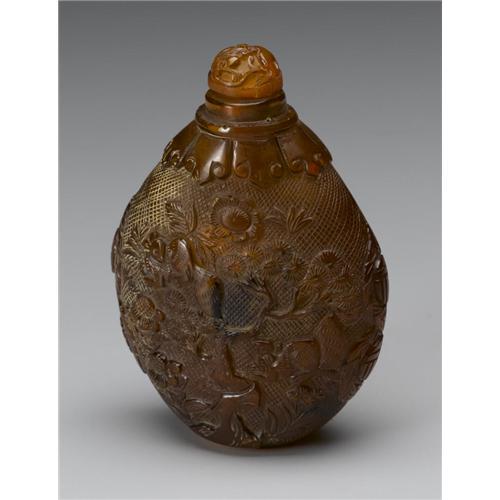 <B>CHINESE CARVED AMBERINE SNUFF BOTTLE</B></I><BR><BR>Chinese carved amberine snuff bottle, with designs of horses, squirrels, flowers and pines to each side<BR>4.5in. high<BR><BR> <BR><BR><b>Shipping:</b> Miscellaneous Collectibles, Larg (<a target="_blank" href="http://www.heritageauctions.com/common/shipping.php">view shipping information</a>)