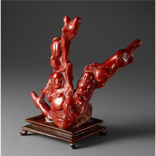 CHINESE CARVED FAUX CORAL GROUP DEPICTING BUDAI