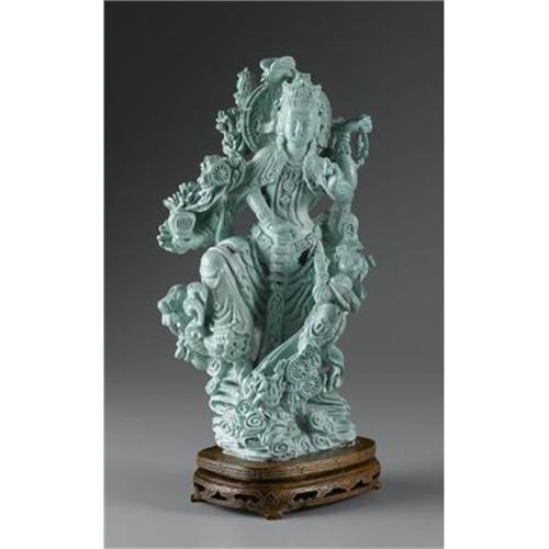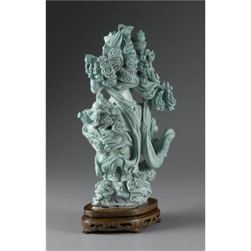 <B>CHINESE CARVED FIGURAL GROUP<BR></B></I><BR>Chinese carved figural group of a multi-armed deity and attendant amid clouds, simulating turquoise. On a wood base<BR>8in. high<BR><BR> <B>Condition Report:</B> Small loss to head of bird.<BR><BR><b>Shipping:</b> Miscellaneous Collectibles, Larg (<a target="_blank" href="http://www.heritageauctions.com/common/shipping.php">view shipping information</a>)