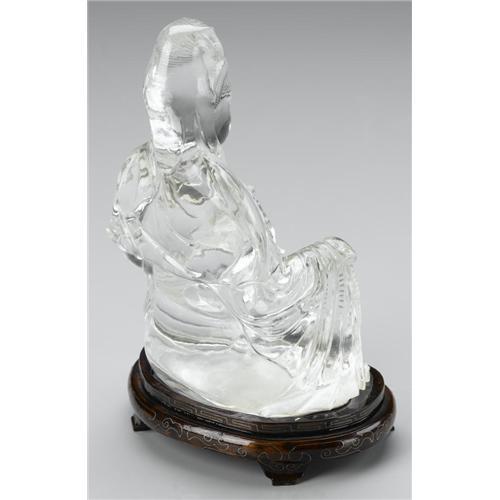 <B>CHINESE CARVED GLASS QUANYIN</B></I><BR><BR>Chinese carved glass figure of a seated guanyin, with two inlaid colored beads to forehead, and holding prayer beads and a vessel. On a wood stand<BR>7in. high<BR><BR> <B>Condition Report:</B> Normal signs of wear as appropriate with age.<BR><BR><b>Shipping:</b> Hollowware/Pottery/Glass, Small (<a target="_blank" href="http://www.heritageauctions.com/common/shipping.php">view shipping information</a>)