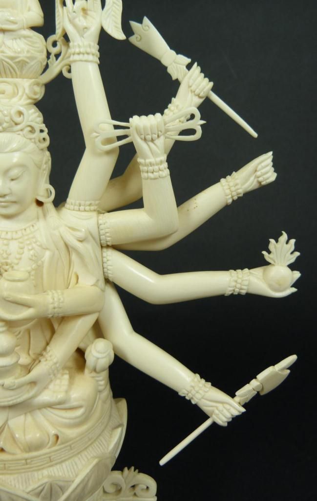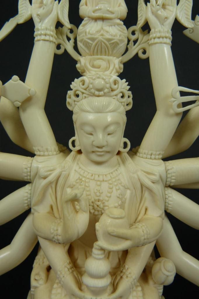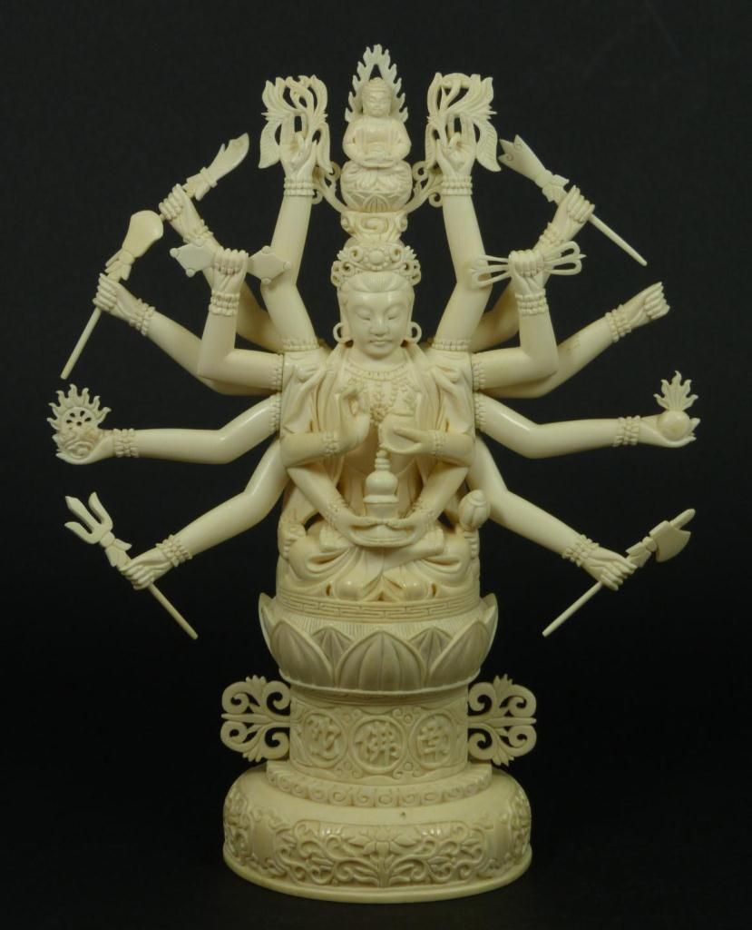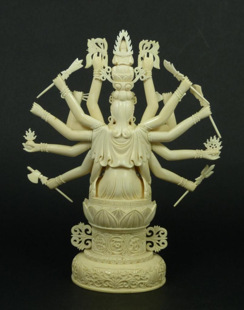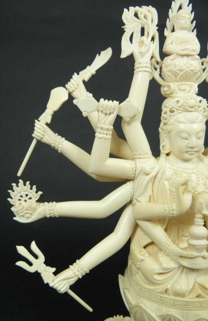 Chinese fully relief carved ivory 12 arm goddess figure. She is holding various items to each hand. Atop her head is seated Guan Yin on lotus blossom throne. The goddess is also seated on stylized lotus blossom throne over relief carved base having calligraphy and scrolled floral designs. Holds Qianlong (1736-1795) four character calligraphy reign marks to bottom. Made late Qing to Republic period. Measures 10 1/2" height x 8 1/2" width (26.7cm x 21.6cm). Total weight of 845 grams.