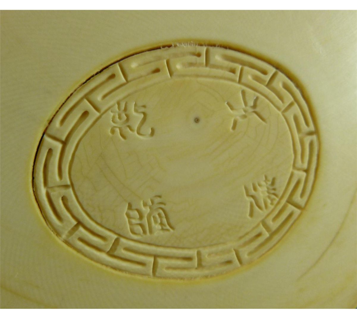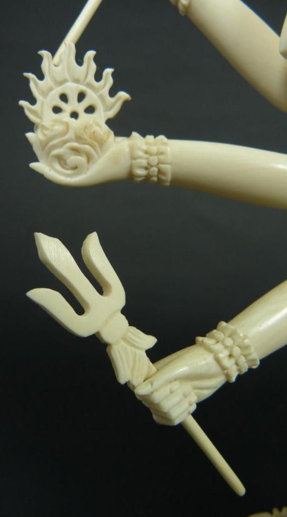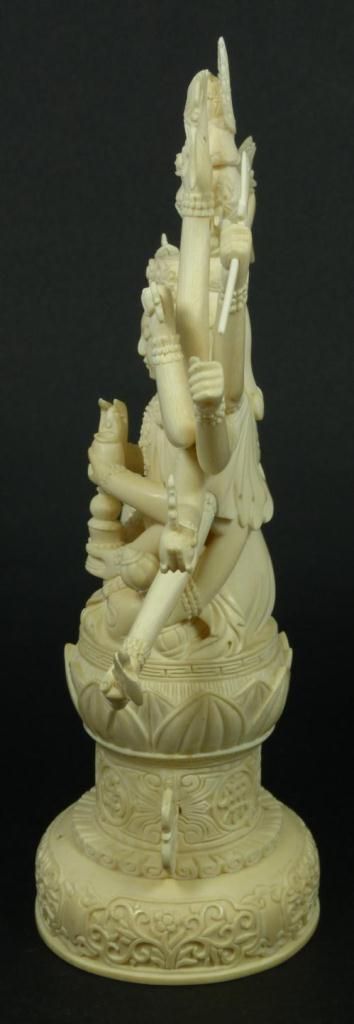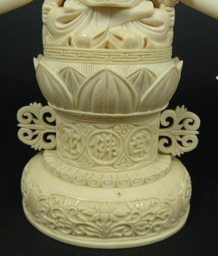 Chinese fully relief carved ivory 12 arm goddess figure. She is holding various items to each hand. Atop her head is seated Guan Yin on lotus blossom throne. The goddess is also seated on stylized lotus blossom throne over relief carved base having calligraphy and scrolled floral designs. Holds Qianlong (1736-1795) four character calligraphy reign marks to bottom. Made late Qing to Republic period. Measures 10 1/2" height x 8 1/2" width (26.7cm x 21.6cm). Total weight of 845 grams.