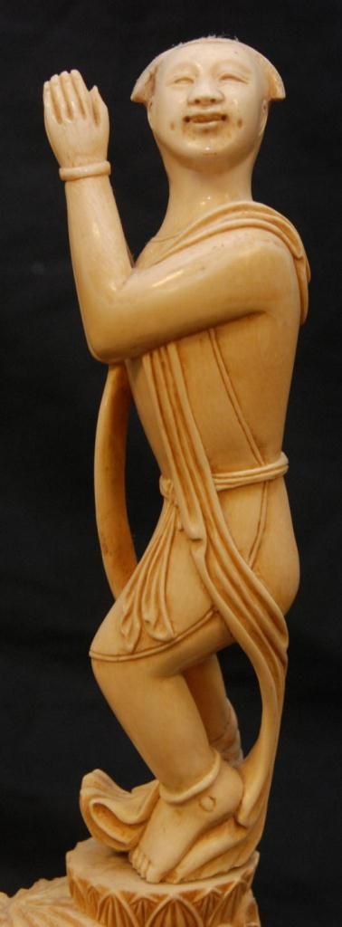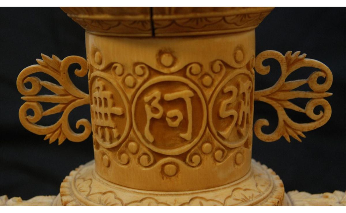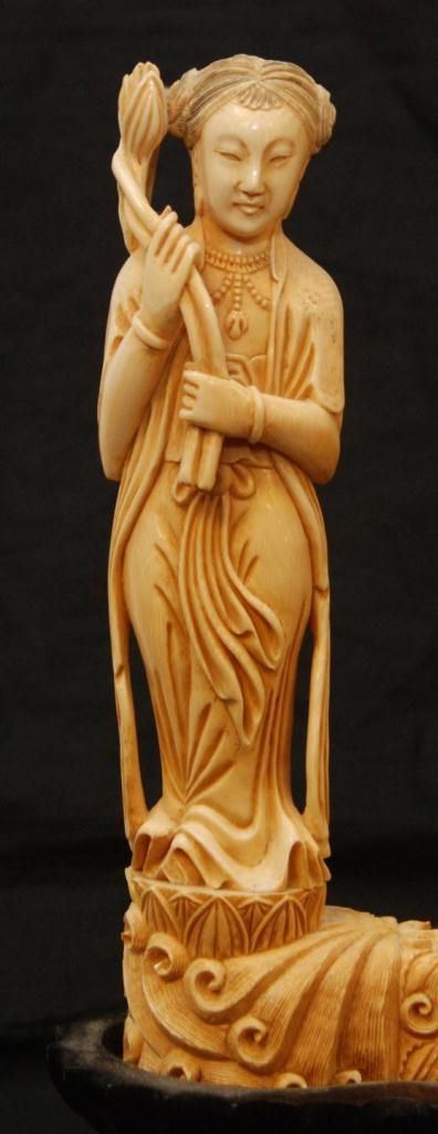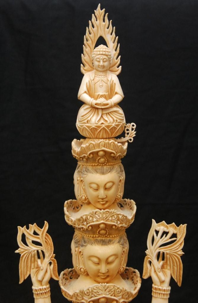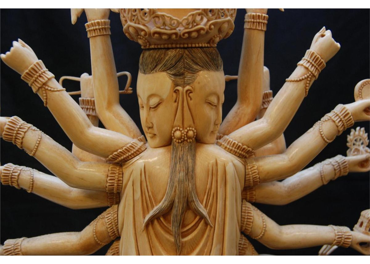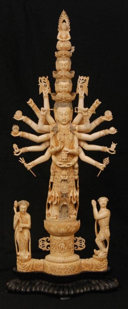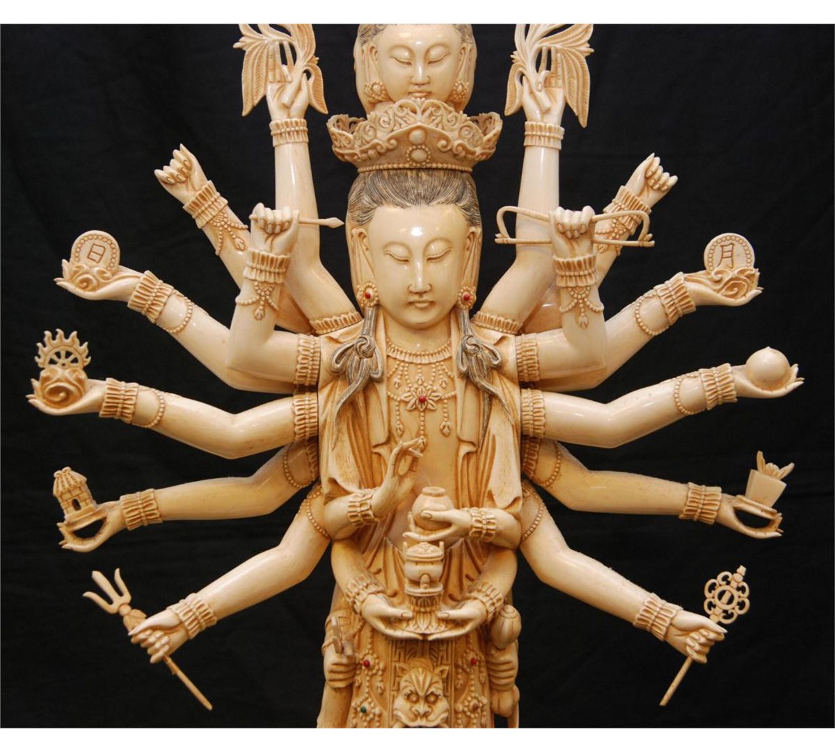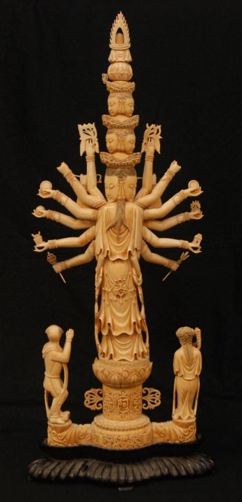 A stunning large Chinese carved ivory 14 armed goddess sculpture with multiple heads and crowned with seated Buddha. She is standing on stylized lotus blossom base with urn design. To each side is attendants. Mounted on fitted wooden base. Measures 36 3/4" height x 14" width + 2 1/2" base height (93.3cm x 35.5cm + 6.3cm). Total weight of 9.42 kilograms.