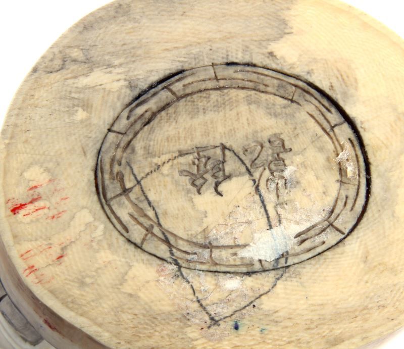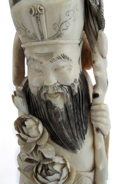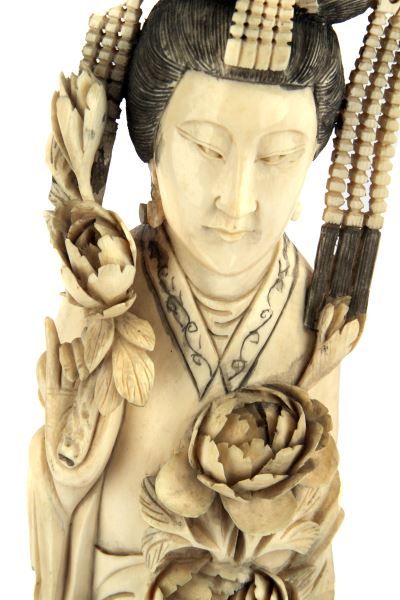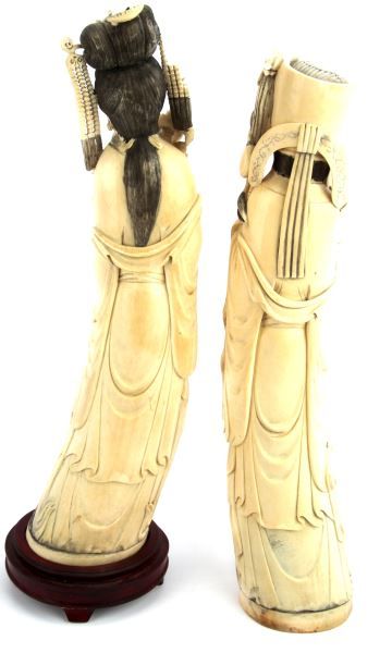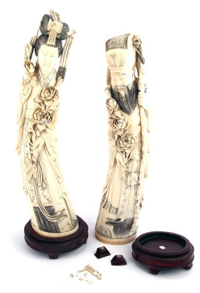 Pair of large Chinese carved ivory African elephant emperor and empress tusk figures; c. 19th century. Intricately carved, the pair depicts an emperor and empress holding lotus flowers, the emperor also holds a dragon-headed staff. Each measures approximately 18.5 inches high with a 12 inch circumference at the base. Both have fitted wooden bases. Some of the petal tips are chipped and the finely carved headdress has damage. All detached pieces are present and require repair; one wooden base is also damaged. Bottom signed on each. Overall in very good condition for age. This lot can only be shipped within the United States.