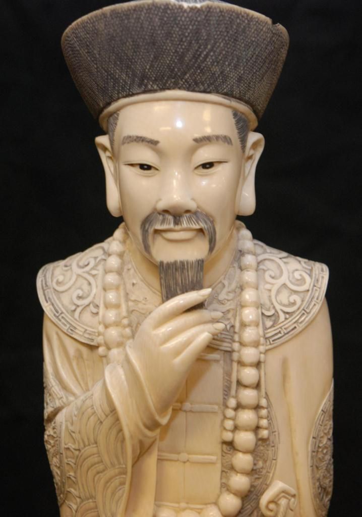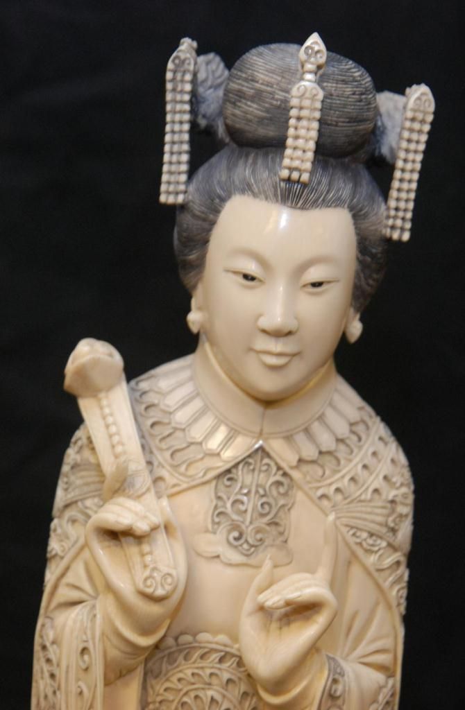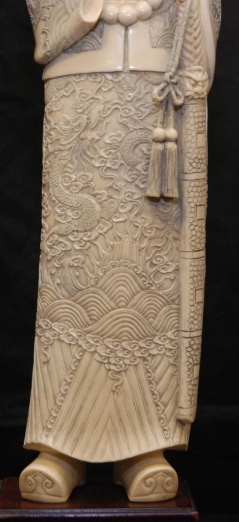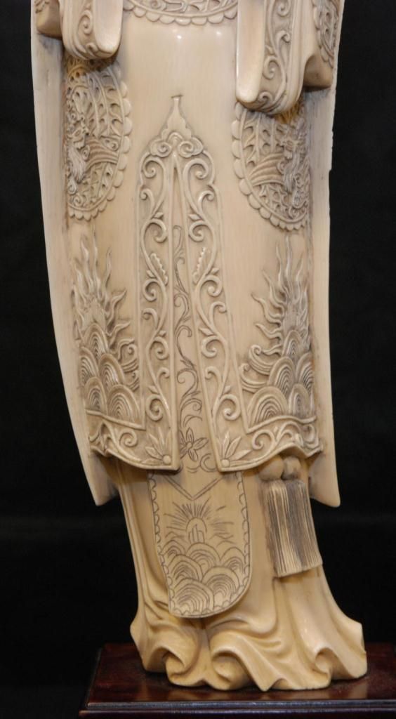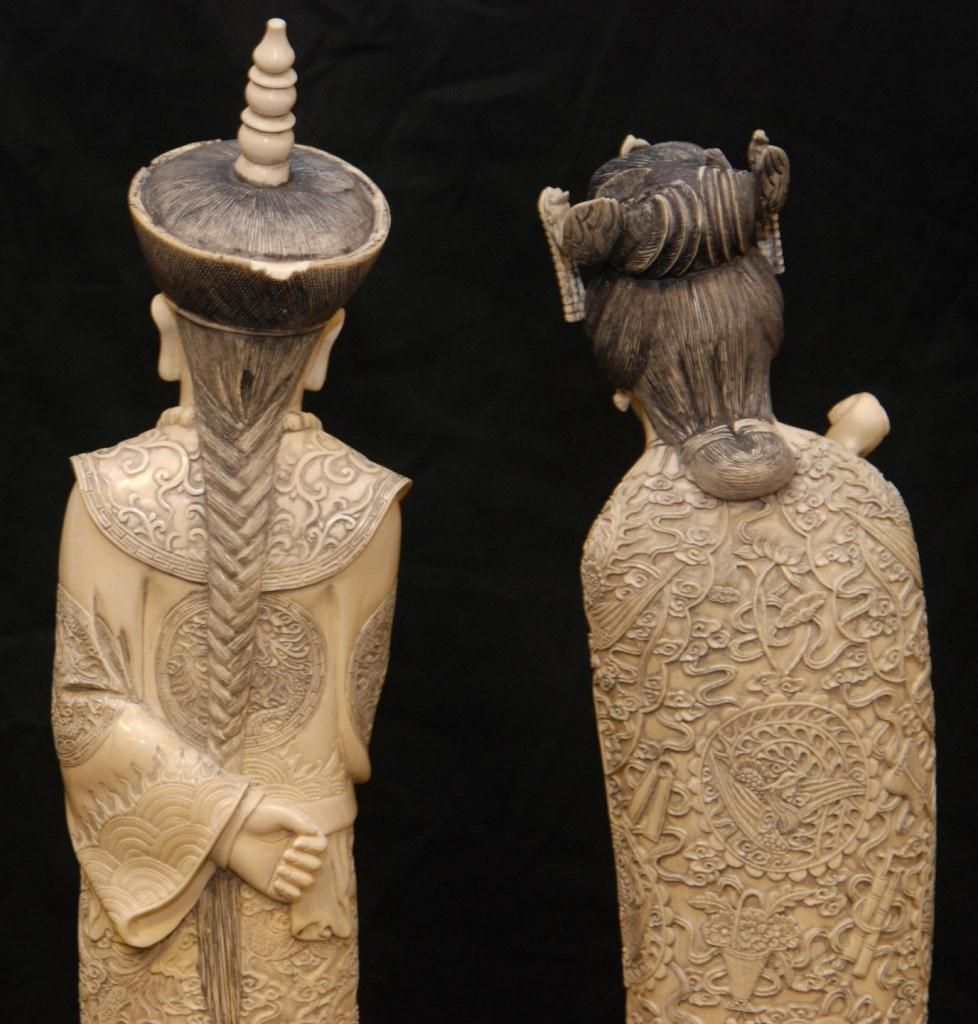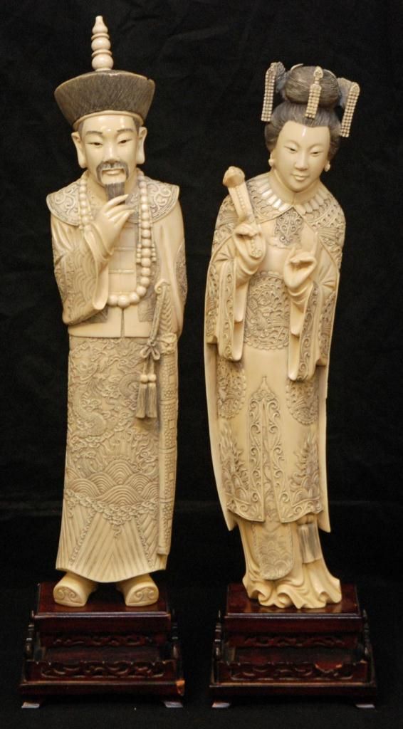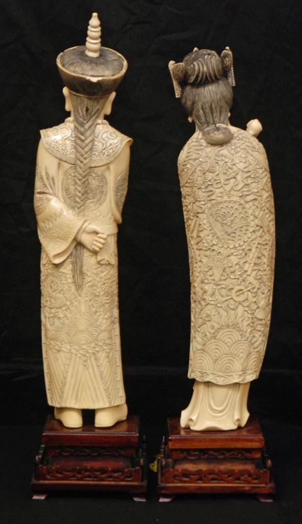 Pair of Chinese carved ivory Emperor and Empress figures. Each having a finely carved relief design to layered robes. The emperor having an impressive dragons design with clouds and crashing waves. The Empress having a Phoenix with flames and crashing water with scrolled vines. Each mounted on tiered wooden footed base. Late Qing dynasty to Republic period. Tallest measures 19 3/8" height (49.2cm). Total weight of 7.60 kilograms.