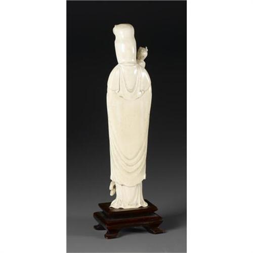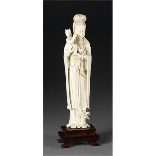 <B>CHINESE CARVED IVORY FIGURE</B></I><BR>Late Nineteenth/Early Twentieth Century<BR>Ivory<BR>Unmarked<BR>8-1/8in. high<BR><BR>Chinese carved ivory figure of a Guanyin or a beauty, holding a child and prayer beads, on wood stand<BR><BR> <B>Condition Report:</B> Normal signs of wear as appropriate with age; loss to prayer beads.<BR><BR><b>Shipping:</b> Hollowware/Pottery/Glass, Small (<a target="_blank" href="http://www.heritageauctions.com/common/shipping.php">view shipping information</a>) <BR><BR><B>Important notice