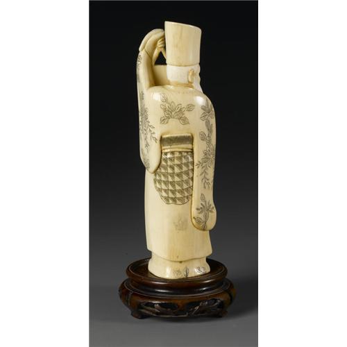 <B>CHINESE CARVED IVORY FIGURE</B></I><BR>Late Nineteenth/Early Twentieth Century<BR>Ivory<BR>Unmarked<BR>7in. high<BR><BR>Chinese carved ivory figure of a sage holding an open scroll, on wood stand<BR><BR> <B>Condition Report:</B> Normal signs of wear as appropriate with age; crack to front.<BR><BR><b>Shipping:</b> Hollowware/Pottery/Glass, Small (<a target="_blank" href="http://www.heritageauctions.com/common/shipping.php">view shipping information</a>) <BR><BR><B>Important notice