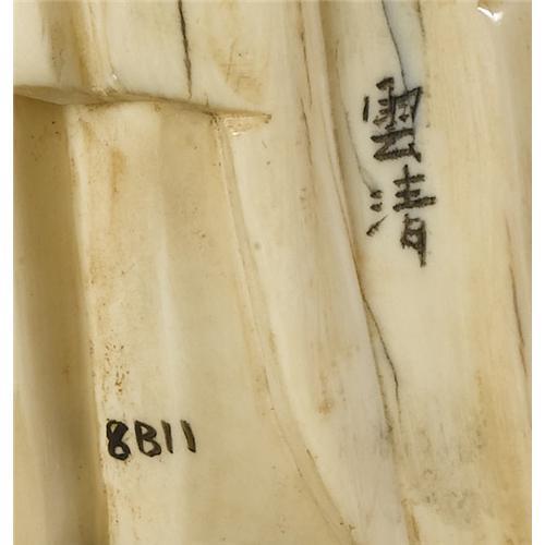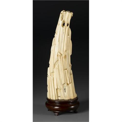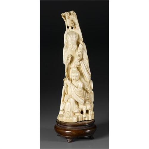 <B>CHINESE CARVED IVORY GROUP</B></I><BR>Late Nineteenth/Early Twentieth Century<BR>Ivory<BR>Signed<BR>9-1/4in. high<BR><BR>Chinese carved ivory group in "tusk" form of a sage holding bamboo beneath a pine tree, with a musician in front, on a wood stand<BR><BR> <B>Condition Report:</B> Musician missing instrument, sage missing what he was holding, and minor glue stains.<BR><BR><b>Shipping:</b> Hollowware/Pottery/Glass, Small (<a target="_blank" href="http://www.heritageauctions.com/common/shipping.php">view shipping information</a>) <BR><BR><B>Important notic