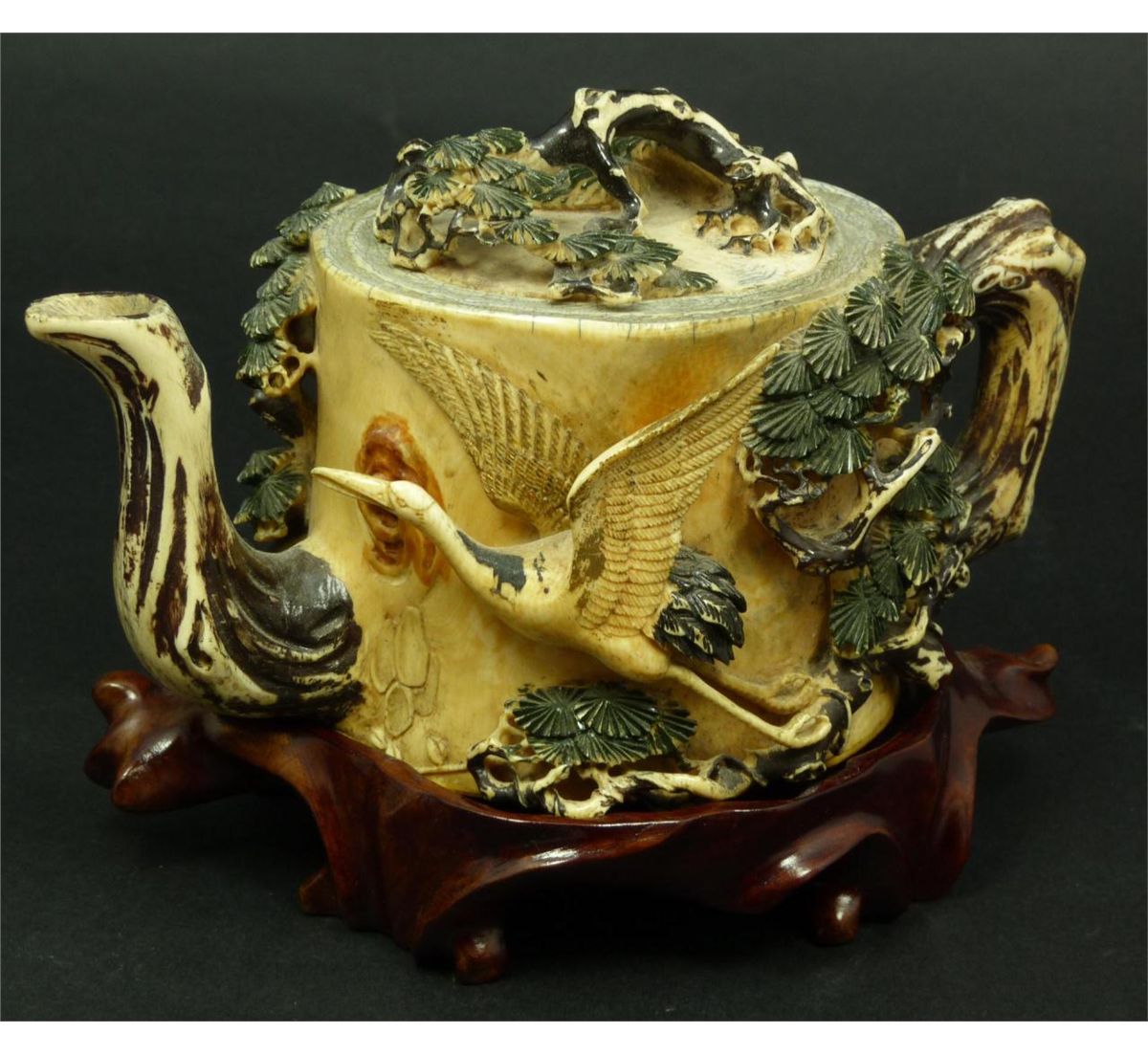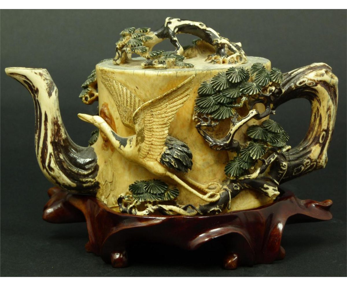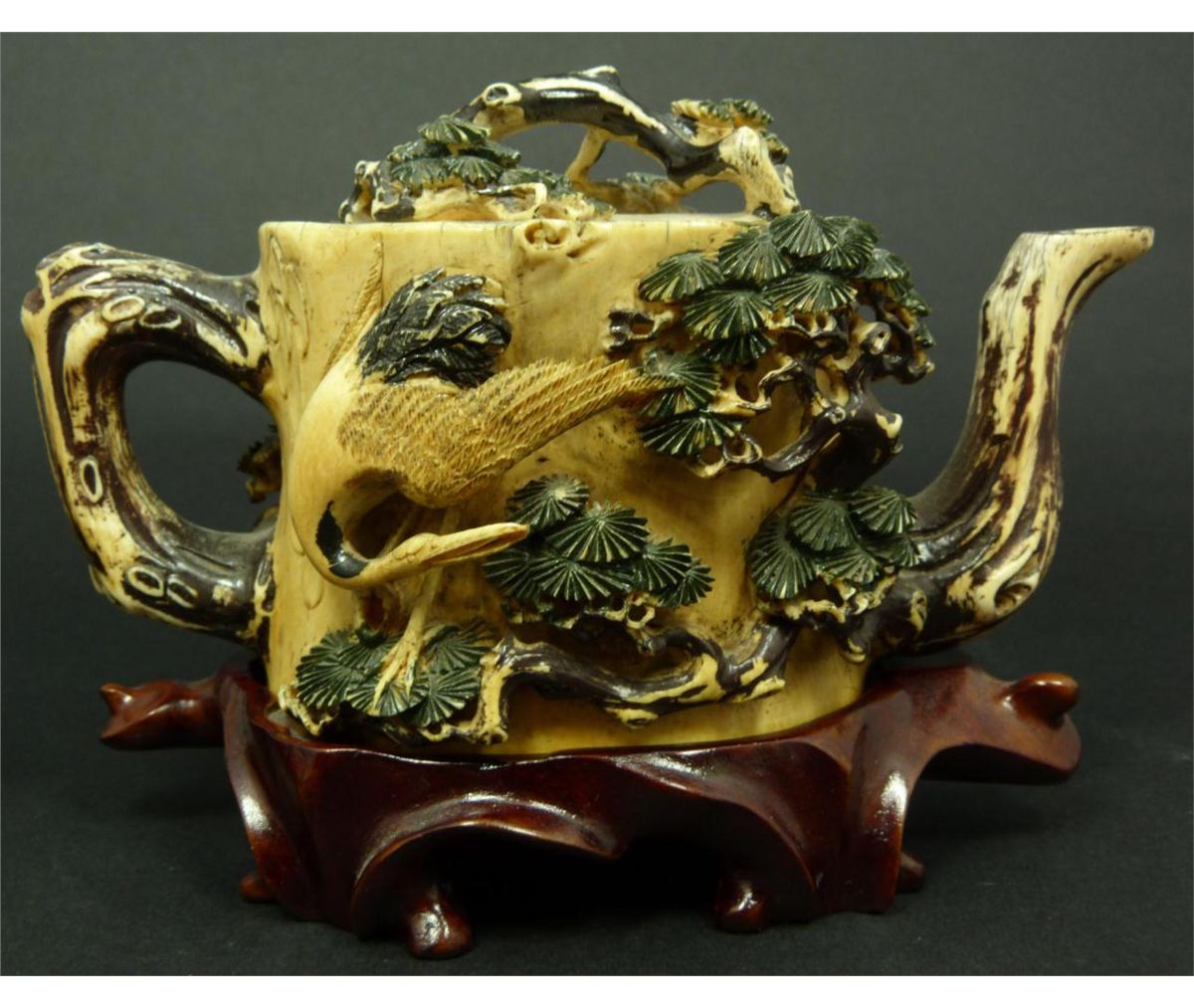An antique Qing Dynasty period Chinese relief carved and polychromed ivory tea pot having a figural wooden stump form with branch form handle and spout. Has raised design depicting pine leaves and birds. Includes fitted wooden base. 18th/19th century. Measures 3 7/8" height x 6 3/4" length + 1" base height (9.8cm x 17.1cm + 2.5cm). Ivory weight of 441 grams.