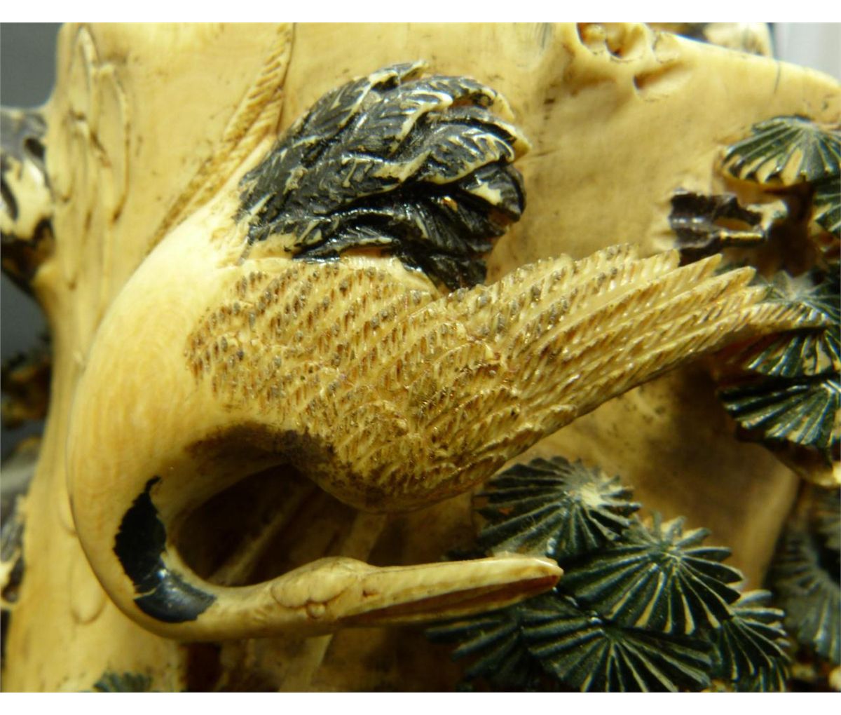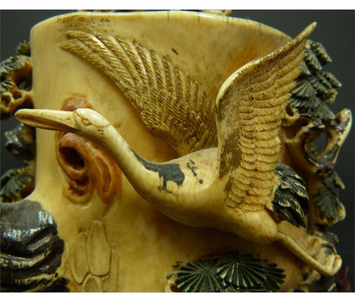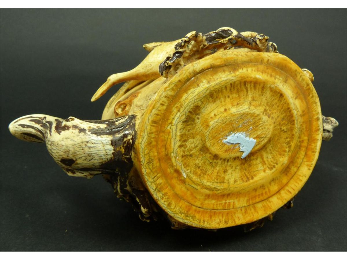 An antique Qing Dynasty period Chinese relief carved and polychromed ivory tea pot having a figural wooden stump form with branch form handle and spout. Has raised design depicting pine leaves and birds. Includes fitted wooden base. 18th/19th century. Measures 3 7/8" height x 6 3/4" length + 1" base height (9.8cm x 17.1cm + 2.5cm). Ivory weight of 441 grams.