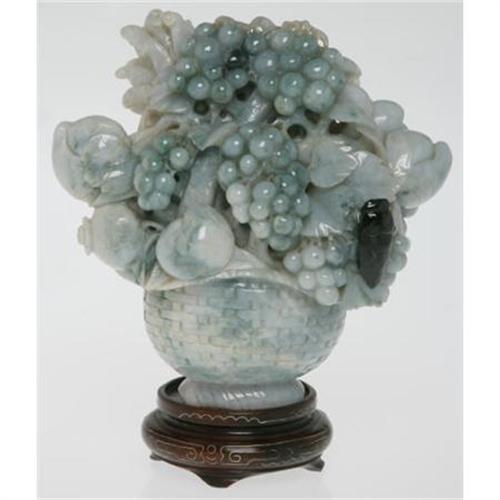 <B>CHINESE CARVED JADE BASKET OF FRUIT</B></I><BR><BR>A carved jade basket of fruit with cicada, set on an inlaid wood stand<BR>7-1/2in. high x 7in. wide x 5in. deep<BR><BR> <B>Condition Report:</B> Normal signs of wear as appropriate with age; old repair, tiny chip, surface dirt.<BR><BR><b>Shipping:</b> Miscellaneous Collectibles, Larg (<a target="_blank" href="http://www.heritageauctions.com/common/shipping.php">view shipping information</a>)