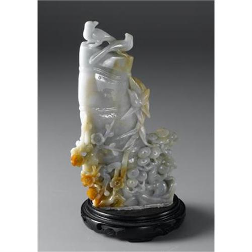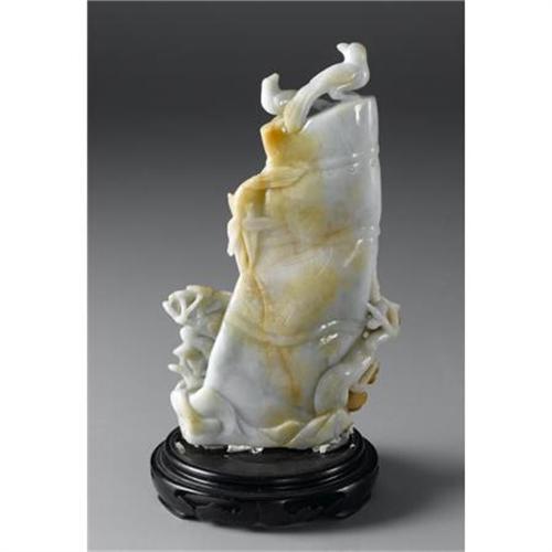 <B>CHINESE CARVED JADE/HARDSTONE GROUP</B></I><BR><BR>Chinese carved jade/hardstone group, depicting a bamboo stalk with pines, blossoming vines, and birds. Of pale green coloration with rust suffusions. On a wood stand<BR>7-1/2in. high<BR><BR> <B>Condition Report:</B> Loss to one flower blossom on left side, loss to beak of one bird.<BR><BR><b>Shipping:</b> Miscellaneous Collectibles, Larg (<a target="_blank" href="http://www.heritageauctions.com/common/shipping.php">view shipping information</a>)