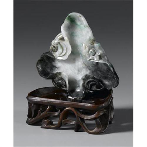 <B>CHINESE CARVED JADE/HARDSTONE BRUSH WASHER</B></I><BR><BR>Chinese carved jade/hardstone brush washer in the form of a lotus frond. Of mottled pale green, green, and spinach green coloration. On a wood stand<BR>3.5in. wide<BR><BR> <B>Condition Report:</B> Small chip to edge.<BR><BR><b>Shipping:</b> Miscellaneous Collectibles, Larg (<a target="_blank" href="http://www.heritageauctions.com/common/shipping.php">view shipping information</a>)
