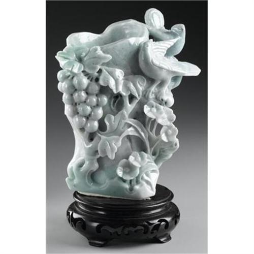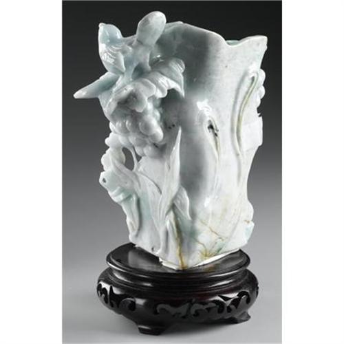 <B>CHINESE JADE/HARDSTONE BRUSHPOT</B></I><BR><BR>Chinese carved jade/hardstone brushpot, with birds amid blossoming flowers and grapes. Of green coloration with rust and bright green suffusions. With a wood stand<BR>7in. high<BR><BR> <B>Condition Report:</B> Normal signs of wear as appropriate with age.<BR><BR><b>Shipping:</b> Miscellaneous Collectibles, Larg (<a target="_blank" href="http://www.heritageauctions.com/common/shipping.php">view shipping information</a>)