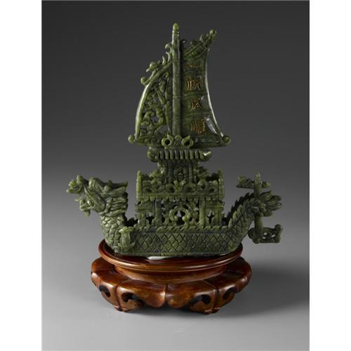 <B>CHINESE CARVED JADE/HARDSTONE GROUP</B></I><BR><BR>Chinese carved jade/hardstone group, depicting a dragon boat, with carved characters on the sail mast. Of dark green coloration. On a wood stand<BR>9-1/4in. high x 8-3/4in. wide<BR><BR> <B>Condition Report:</B> Small loss to tooth of dragon.<BR><BR><b>Shipping:</b> Miscellaneous Collectibles, Larg (<a target="_blank" href="http://www.heritageauctions.com/common/shipping.php">view shipping information</a>)