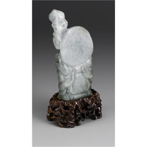 <B>CHINESE CARVED JADE/HARDSTONE BUDDAI</B></I><BR><BR>Chinese carved jade/hardstone figure of a standing Buddai, holding a staff with peaches and a strand of coins. Of green coloration. On an openwork carved wood stand<BR>5-7/8in. high<BR><BR> <B>Condition Report:</B> Normal signs of wear as appropriate with age.<BR><BR><b>Shipping:</b> Miscellaneous Collectibles, Larg (<a target="_blank" href="http://www.heritageauctions.com/common/shipping.php">view shipping information</a>)