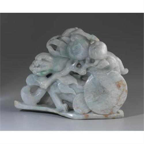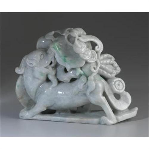 <B>CHINESE JADE/HARDSTONE QILIN</B></I><BR><BR>Chinese carved jade/hardstone figure of a qilin, surrounded by a bat, taels, Buddha's Hand, a blossoming vine with peaches, and coins. Of mottled light green coloration with bright green and rust suffusions. On a jade/hardstone base<BR>5-1/2in. high x 7-1/2in. long<BR><BR> <B>Condition Report:</B> Normal signs of wear as appropriate with age.<BR><BR><b>Shipping:</b> Miscellaneous Collectibles, Smal (<a target="_blank" href="http://www.heritageauctions.com/common/shipping.php">view shipping information</a>)