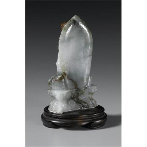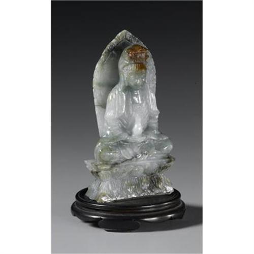 <B>CHINESE CARVED JADE/HARDSTONE BUDDHA</B></I><BR><BR>Chinese carved jade/hardstone figure of a seated Buddha holding a small vessel, framed by a flaming mandorla and seated on a lotus base. Of pale green and green coloration with dark green suffusions. On a wood stand<BR>4-3/4in. high<BR><BR> <B>Condition Report:</B> Small chips to edge of mandorla.<BR><BR><b>Shipping:</b> Miscellaneous Collectibles, Larg (<a target="_blank" href="http://www.heritageauctions.com/common/shipping.php">view shipping information</a>)