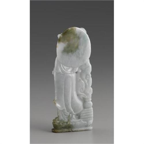 <B>CHINESE CARVED JADE/HARDSTONE GUANYIN</B></I><BR><BR>Chinese carved jade/hardstone figure of a guanyin holding a scepter and standing on a lotus base, next to a writhing dragon. Of pale green coloration with dark green suffusions<BR>5-1/8in. high<BR><BR> <B>Condition Report:</B> Normal signs of wear as appropriate with age.<BR><BR><b>Shipping:</b> Miscellaneous Collectibles, Larg (<a target="_blank" href="http://www.heritageauctions.com/common/shipping.php">view shipping information</a>)