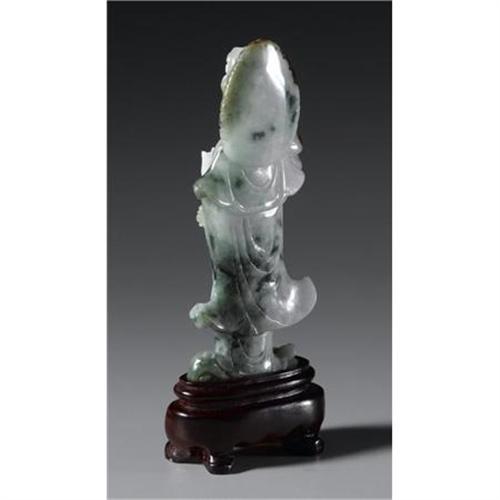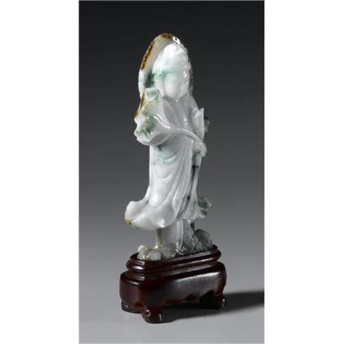 <B>CHINESE CARVED JADE/HARDSTONE GUANYIN</B></I><BR><BR>Chinese carved jade/hardstone figure of a guanyin, framed by a flaming mandorla, and holding a lotus flower in one hand. Of pale green coloration with green and dark green suffusions. On a wood stand<BR>6in. high<BR><BR> <B>Condition Report:</B> Normal signs of wear as appropriate with age.<BR><BR><b>Shipping:</b> Miscellaneous Collectibles, Larg (<a target="_blank" href="http://www.heritageauctions.com/common/shipping.php">view shipping information</a>)