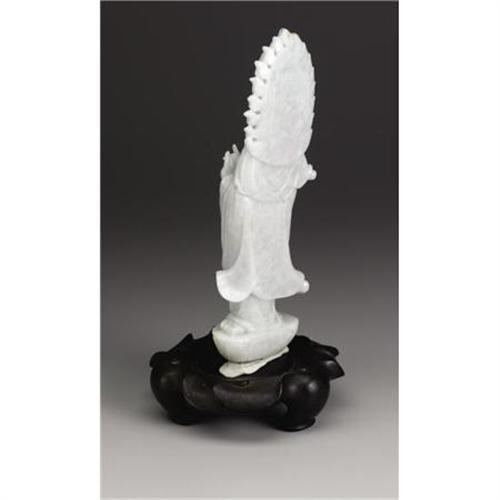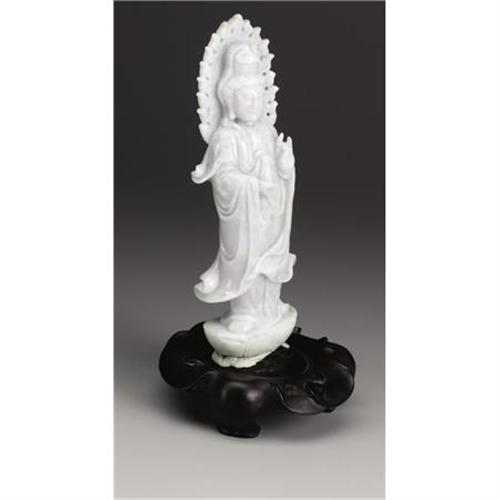 <B>CHINESE CARVED JADE/HARDSTONE GUANYIN</B></I><BR><BR>Chinese carved jade/hardstone figure of a standing guanyin, framed by a flaming reticulated mandorla and holding a bottle, all on a lotus base. Of pale green coloration. On a carved wood stand<BR>7-3/4in. high<BR><BR> <B>Condition Report:</B> Normal signs of wear as appropriate with age.<BR><BR><b>Shipping:</b> Miscellaneous Collectibles, Larg (<a target="_blank" href="http://www.heritageauctions.com/common/shipping.php">view shipping information</a>)