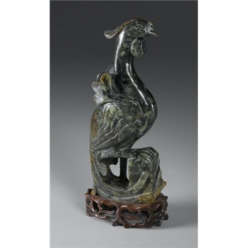 <B>CHINESE CARVED JADE/HARDSTONE FIGURE</B></I><BR><BR>Chinese carved jade/hardstone figure of a phoenix. Of mottled dark green coloration. On a carved openwork wood stand<BR>9.5in. high<BR><BR> <BR><BR><b>Shipping:</b> Miscellaneous Collectibles, Larg (<a target="_blank" href="http://www.heritageauctions.com/common/shipping.php">view shipping information</a>)