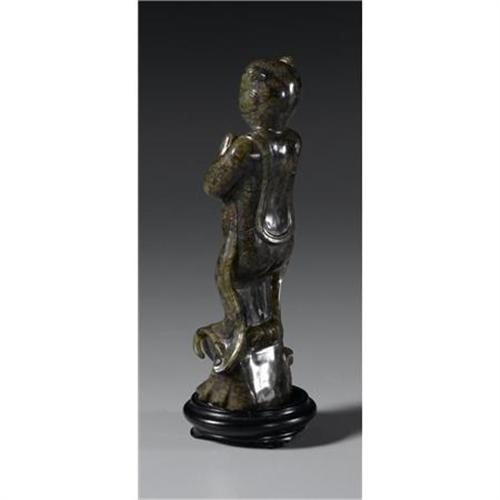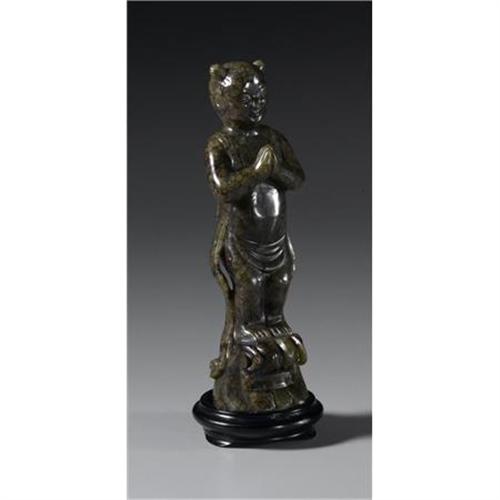 <B>CHINESE CARVED JADE/HARDSTONE FIGURE</B></I><BR><BR>Chinese carved jade/hardstone figure of an attendant with hands clasped together. Of mottled olive green coloration. On a wood stand<BR>6.5in. high<BR><BR> <B>Condition Report:</B> Normal signs of wear as appropriate with age.<BR><BR><b>Shipping:</b> Miscellaneous Collectibles, Larg (<a target="_blank" href="http://www.heritageauctions.com/common/shipping.php">view shipping information</a>)