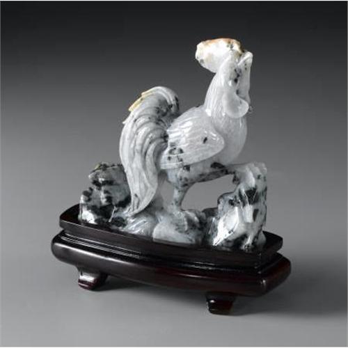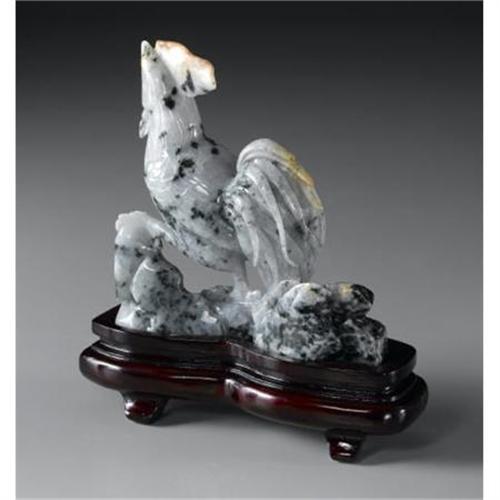 <B>CHINESE CARVED JADE/HARDSTONE FIGURE</B></I><BR><BR>Chinese carved jade/hardstone figure of a rooster, standing on rockery. Of green coloration with spinach green and rust suffusions. On a wood stand<BR>5.5in. high x 5in. wide<BR><BR> <B>Condition Report:</B> Normal signs of wear as appropriate with age.<BR><BR><b>Shipping:</b> Miscellaneous Collectibles, Larg (<a target="_blank" href="http://www.heritageauctions.com/common/shipping.php">view shipping information</a>)