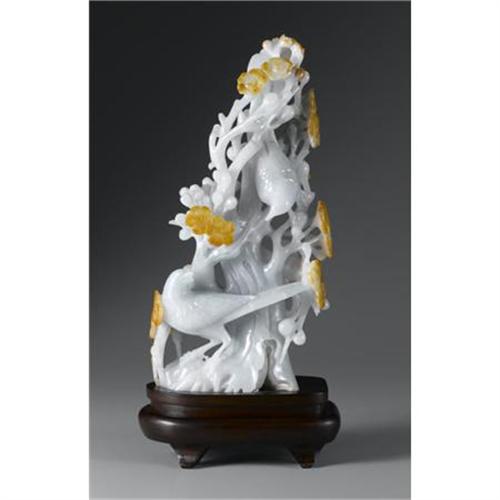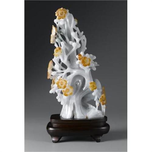 <B>CHINESE CARVED JADE/HARDSTONE GROUP</B></I><BR><BR>Well-carved Chinese jade/hardstone group of birds amid prunus branches. Of pale green coloration with rust "skin" suffusions. On a wood stand<BR>10in. high<BR><BR> <B>Condition Report:</B> Normal signs of wear as appropriate with age.<BR><BR><b>Shipping:</b> Miscellaneous Collectibles, Larg (<a target="_blank" href="http://www.heritageauctions.com/common/shipping.php">view shipping information</a>)