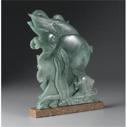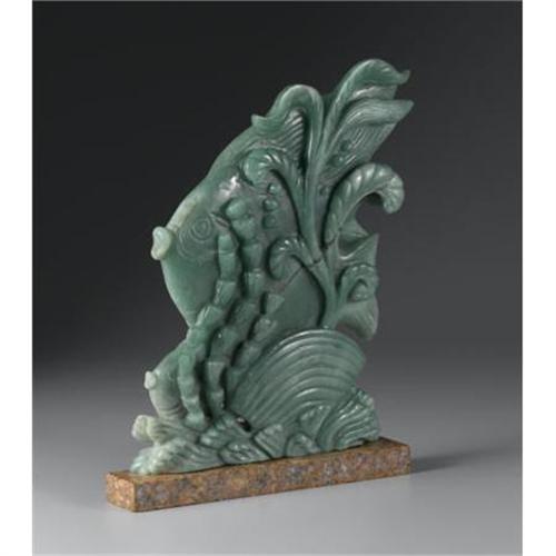 <B>CHINESE CARVED JADE/HARDSTONE GROUP<BR></B></I><BR>Chinese carved jade/hardstone group of fish amid foliage and waves. Of green coloration. On a hardstone base<BR>9in. high<BR><BR> <B>Condition Report:</B> Very minor chipping to fin of fish.<BR><BR><b>Shipping:</b> Miscellaneous Collectibles, Larg (<a target="_blank" href="http://www.heritageauctions.com/common/shipping.php">view shipping information</a>)