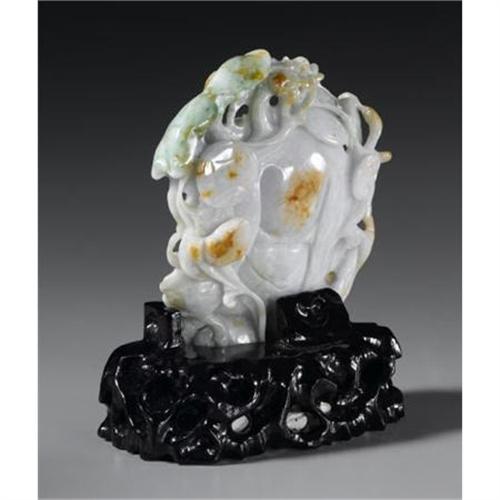 <B>CHINESE CARVED JADE/HARDSTONE SHOULAO</B></I><BR><BR>Chinese carved jade/hardstone openwork group, depicting a seated shoulao, holding a peach and surrounded by deer and lotus. Of pale green coloration with green and rust suffusions. With a wood stand<BR>5in. high<BR><BR> <B>Condition Report:</B> Normal signs of wear as appropriate with age.<BR><BR><b>Shipping:</b> Miscellaneous Collectibles, Larg (<a target="_blank" href="http://www.heritageauctions.com/common/shipping.php">view shipping information</a>)